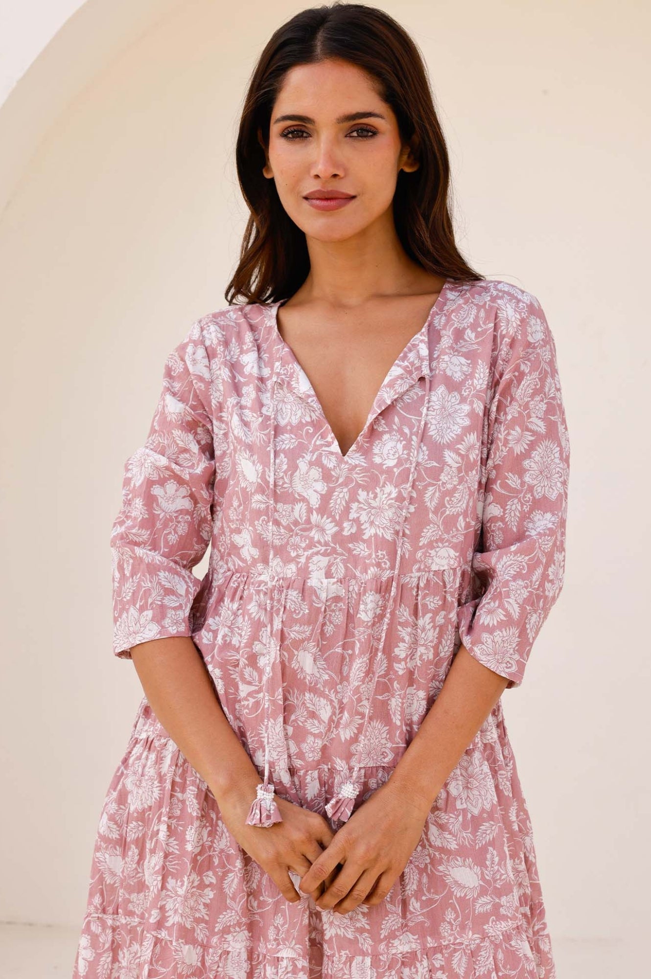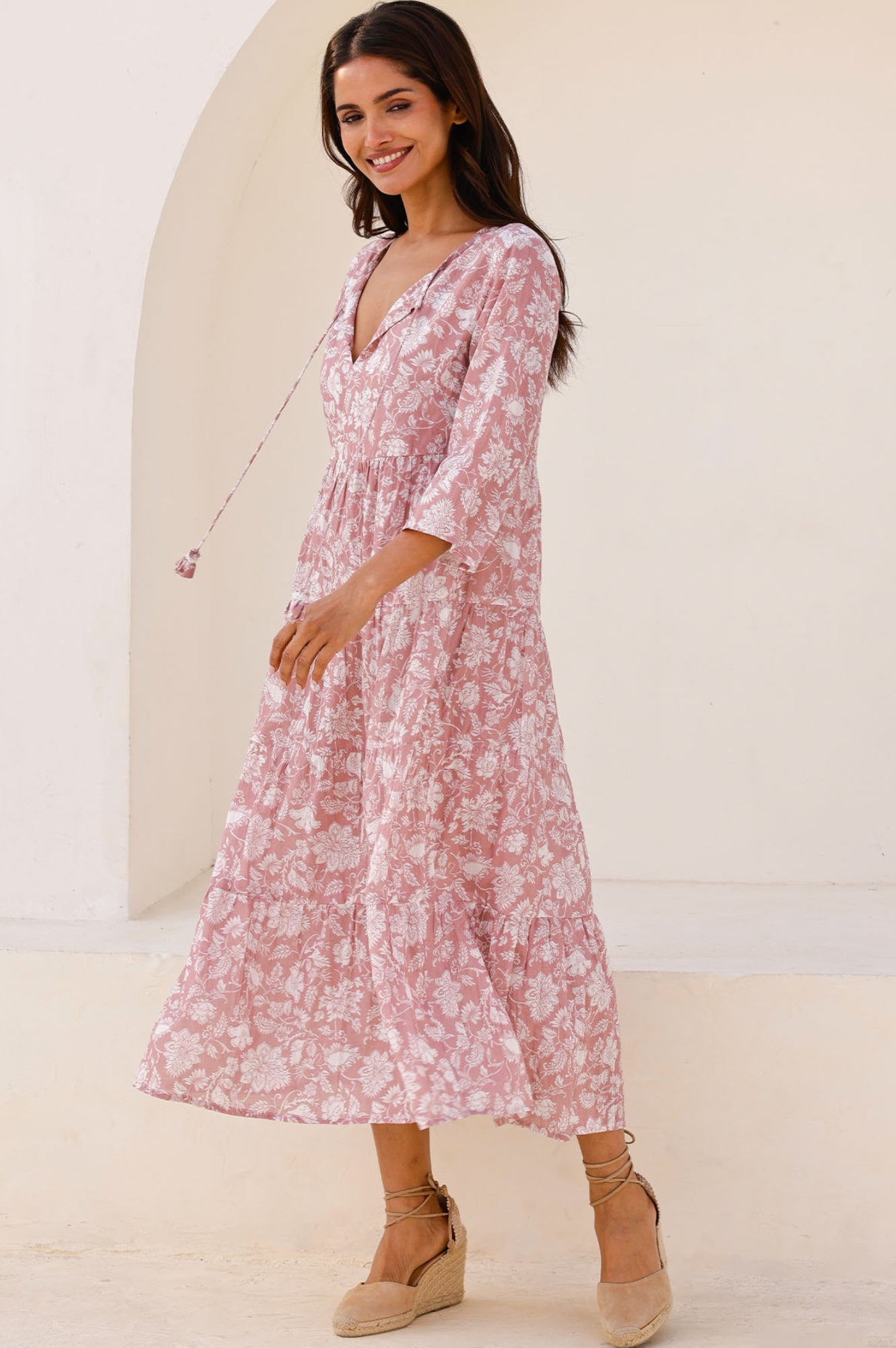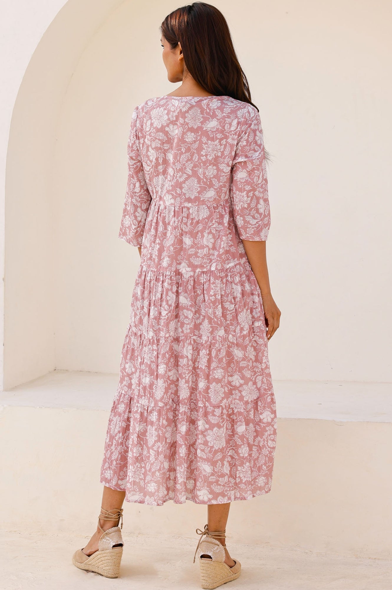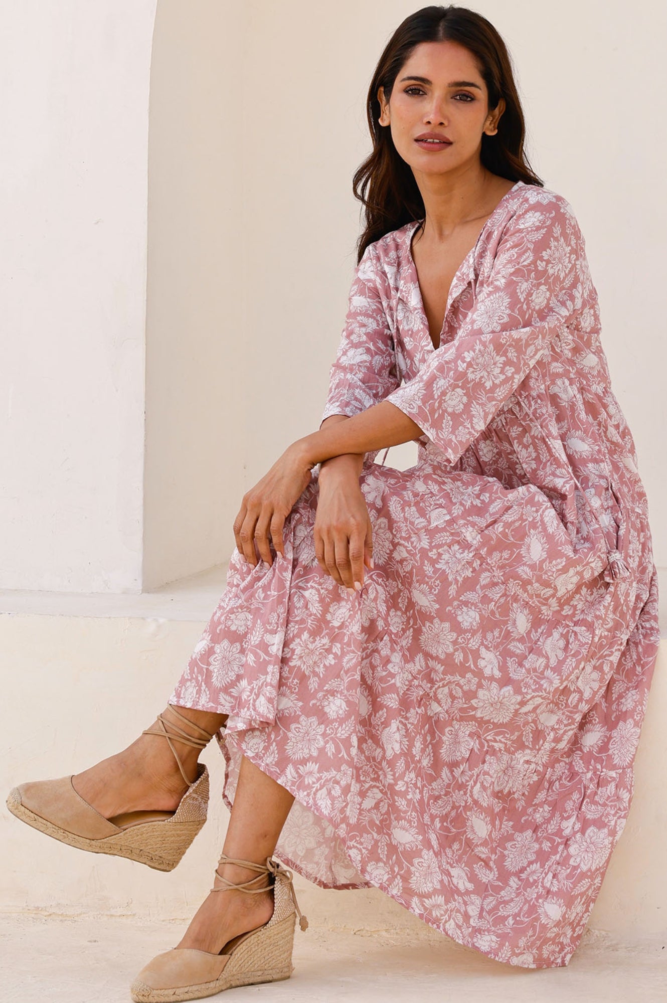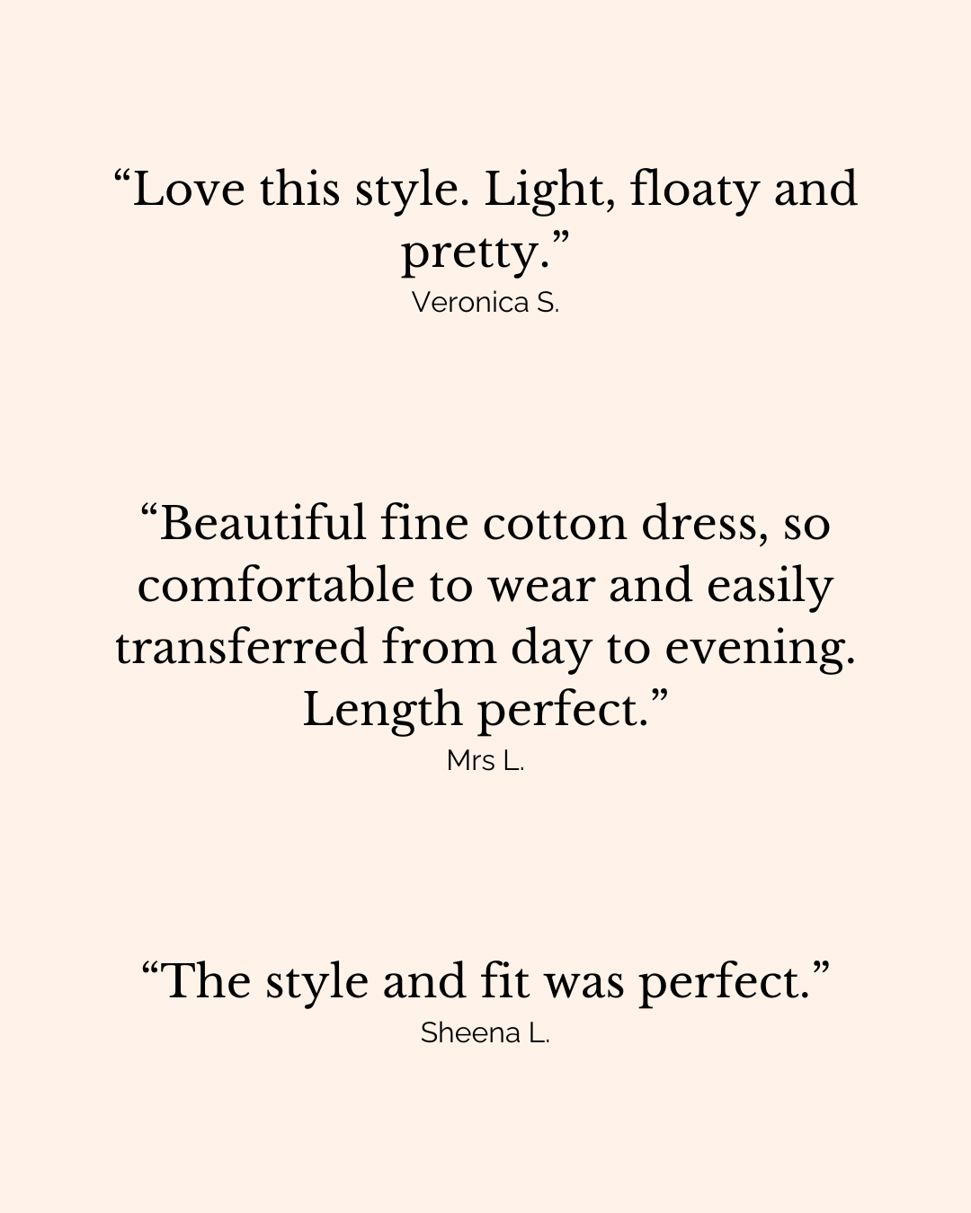 A long-time favourite, our Emma midi dress arrives in lightweight soft organic cotton in a new floral print. Unlined, Emma is easy to wear for beach days or pop on a slip and wear into town. Glass beading detail on the neck ties adds an extra sustainable touch and the sleeve has a very gentle flare.