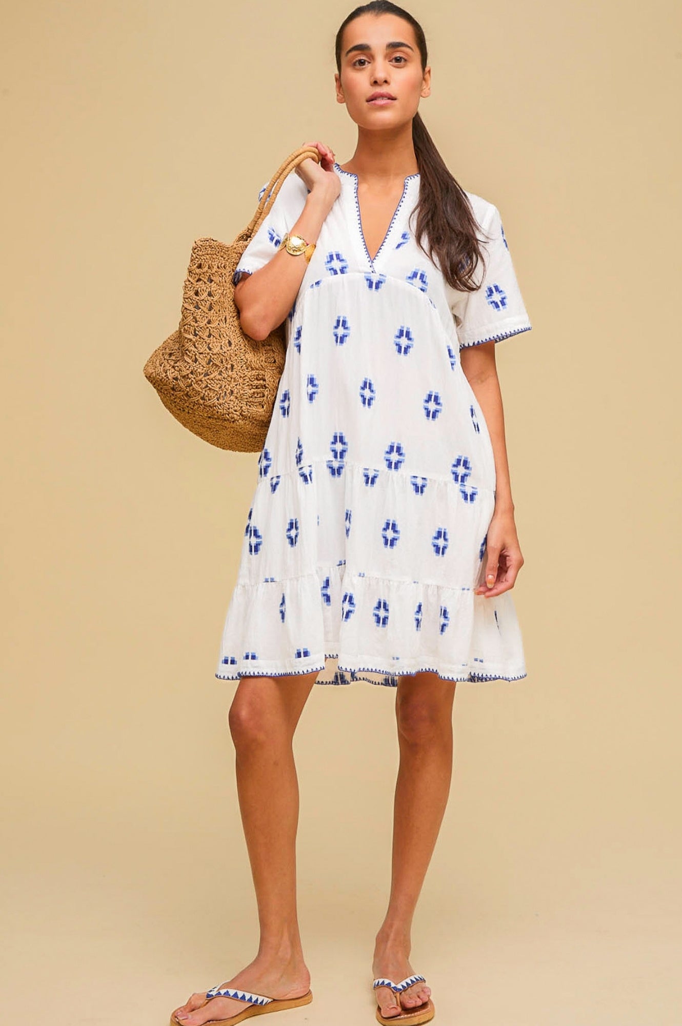 Meet the India dress, made from soft organic cotton gauze in our favourite Meredith shape, which features a deep V notch neckline, short sleeves, and a curved empire waistline. This dress has an all-over embroidery motif and contrast blanket stitch embroidery at the neckline, cuffs, and hem.