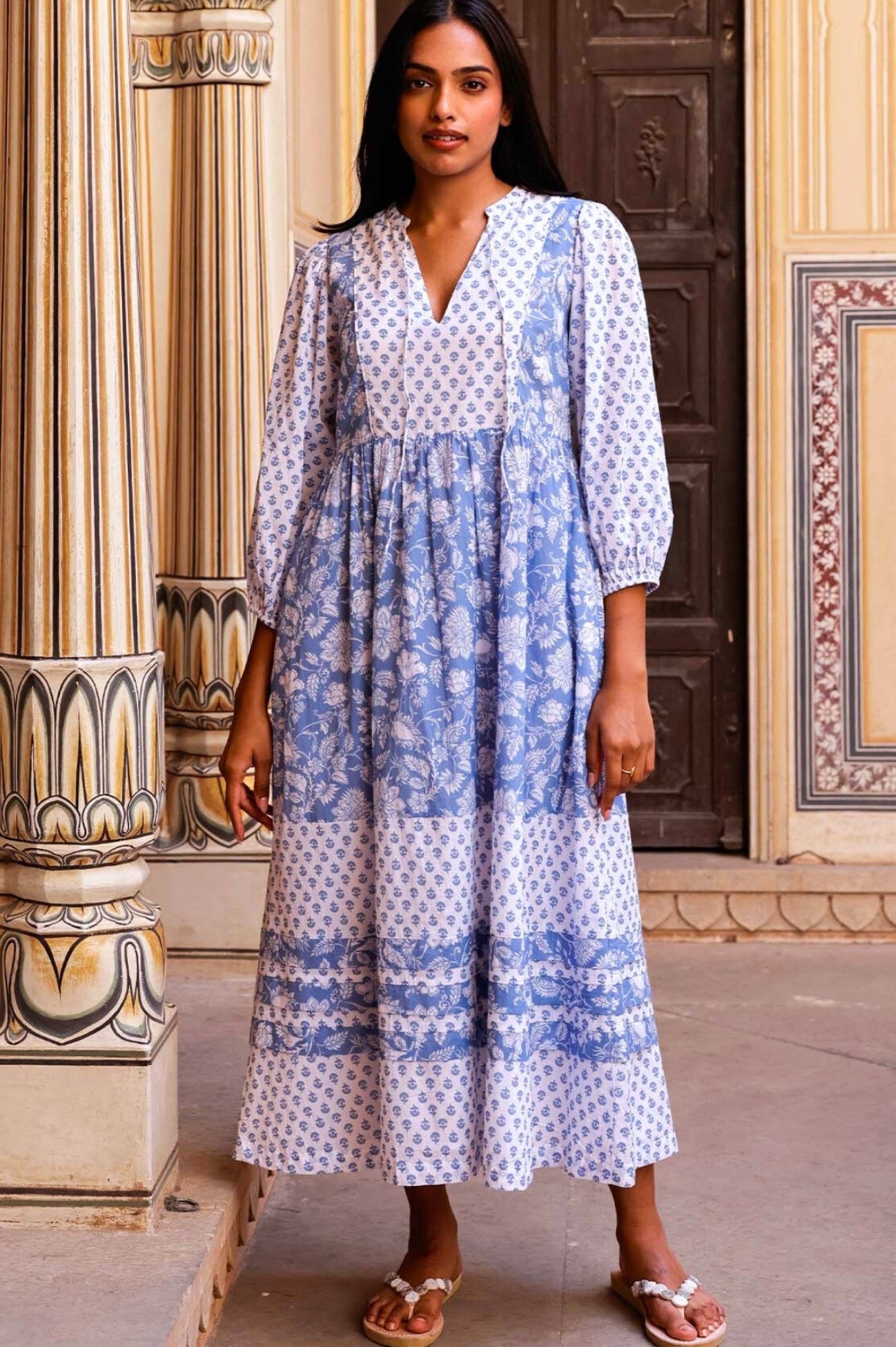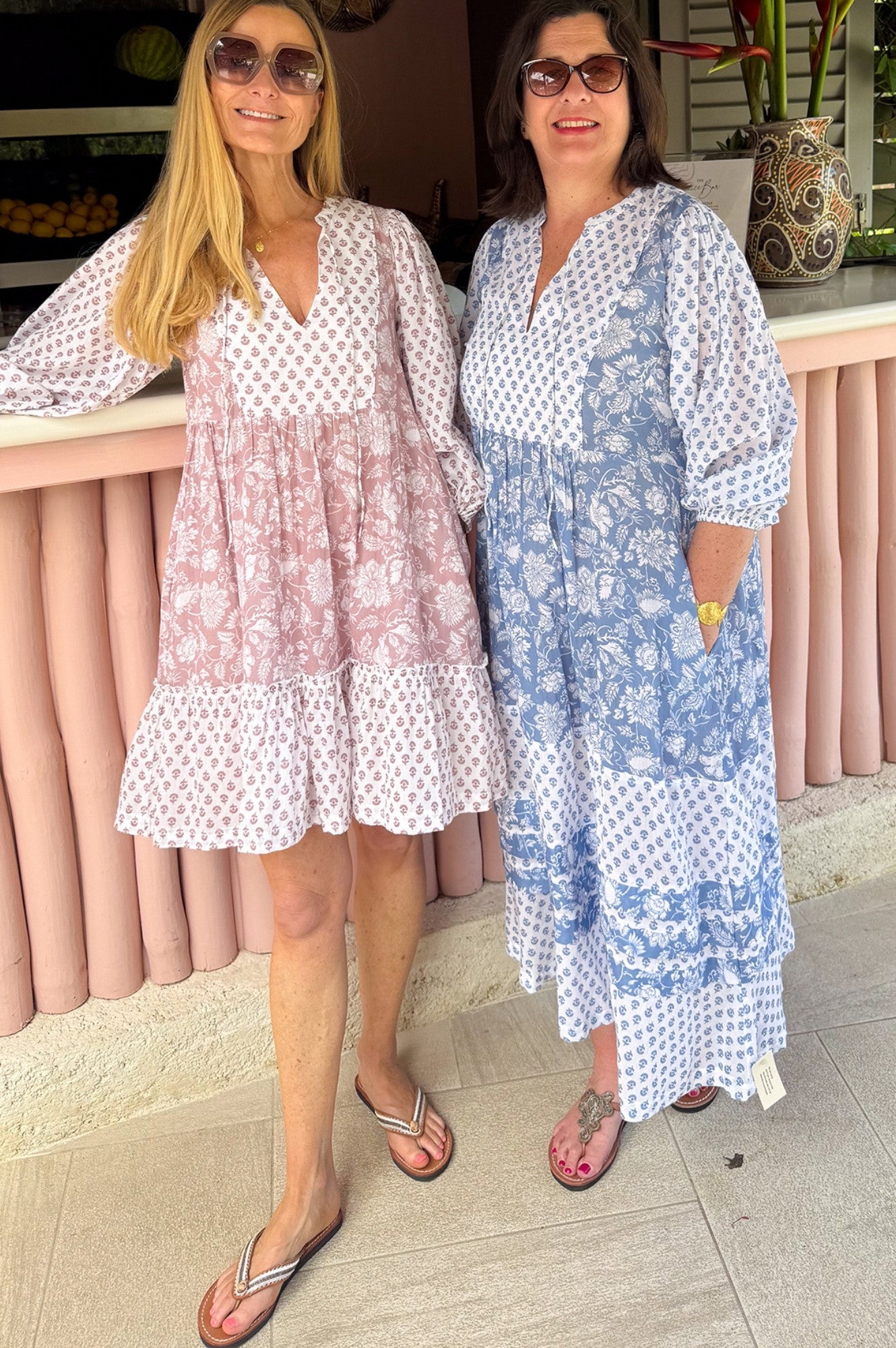 Introducing our Martha Dress, crafted from 100% organic cotton in a flattering midi length. This dress features functional pockets, romantic billowing sleeves with elasticated cuffs, and a graceful V-neckline. The contrasting prints and delicate pleats bring a bold, unique touch, enhancing the dress’s timeless elegance. An optional front tie at the neckline adds versatility and charm. Perfect for your next getaway or a relaxed, chic outing.