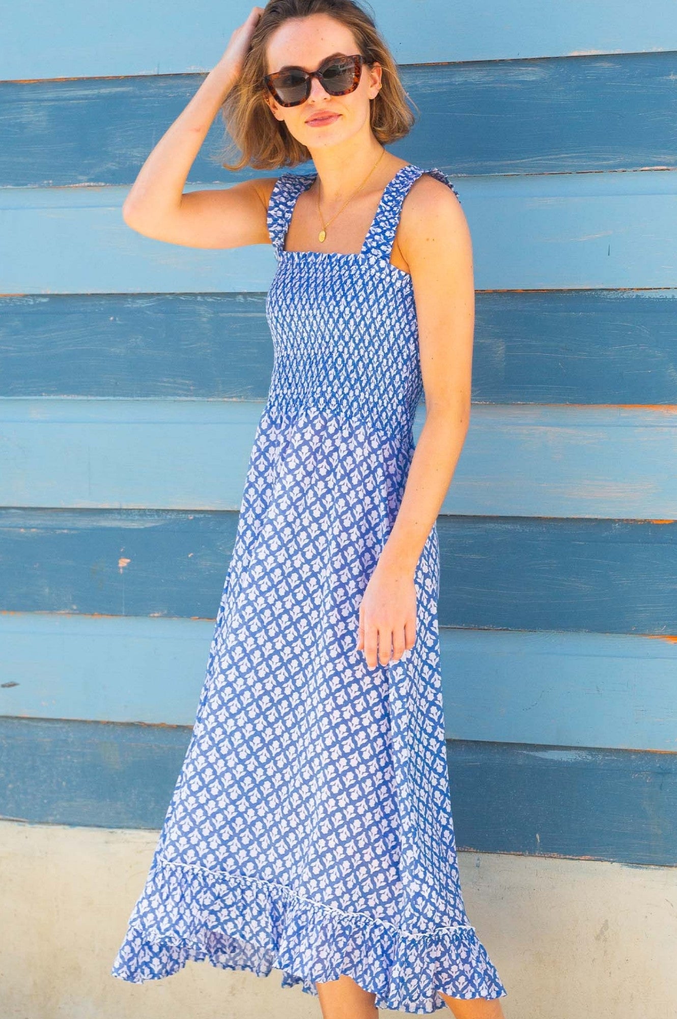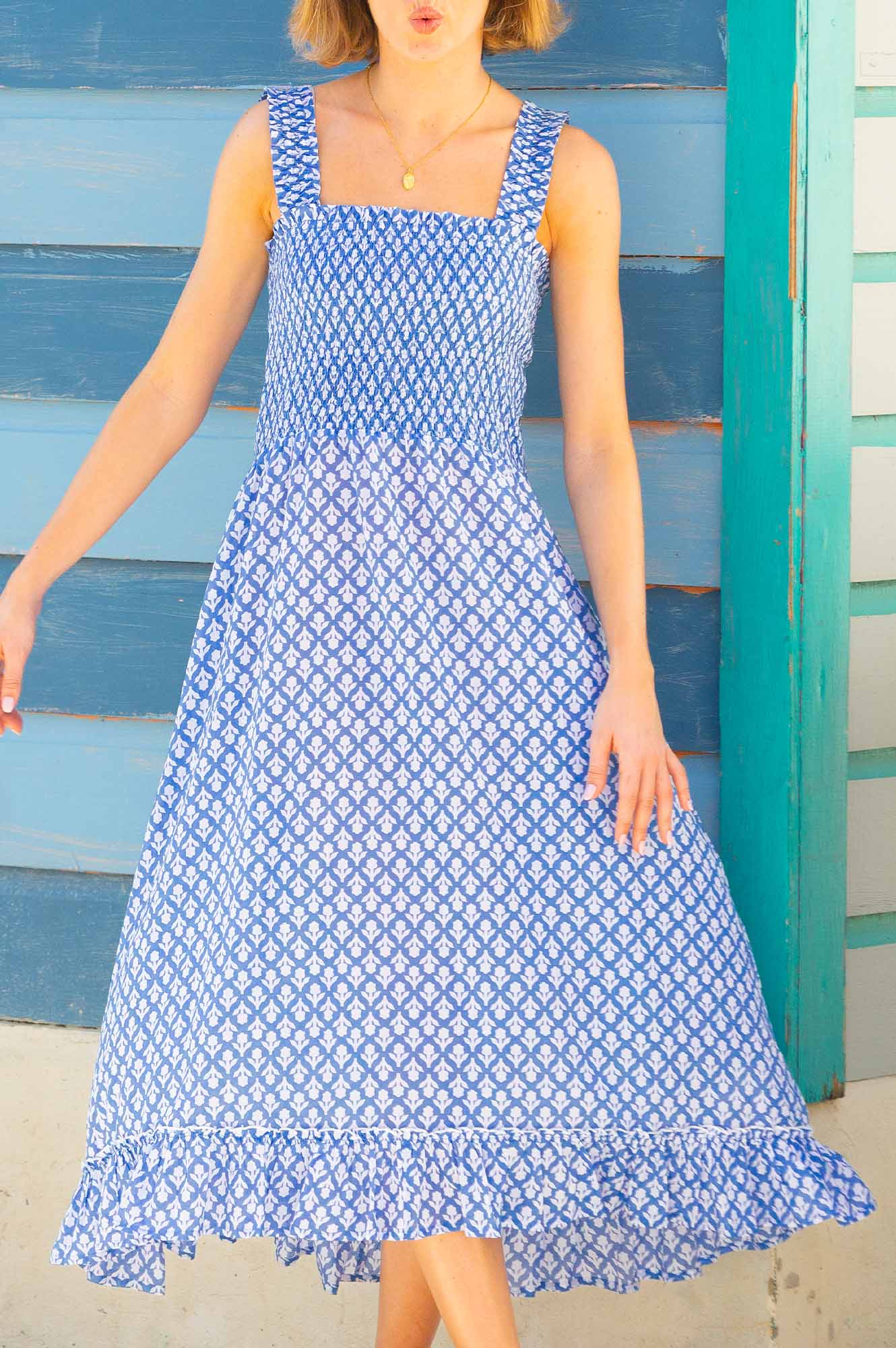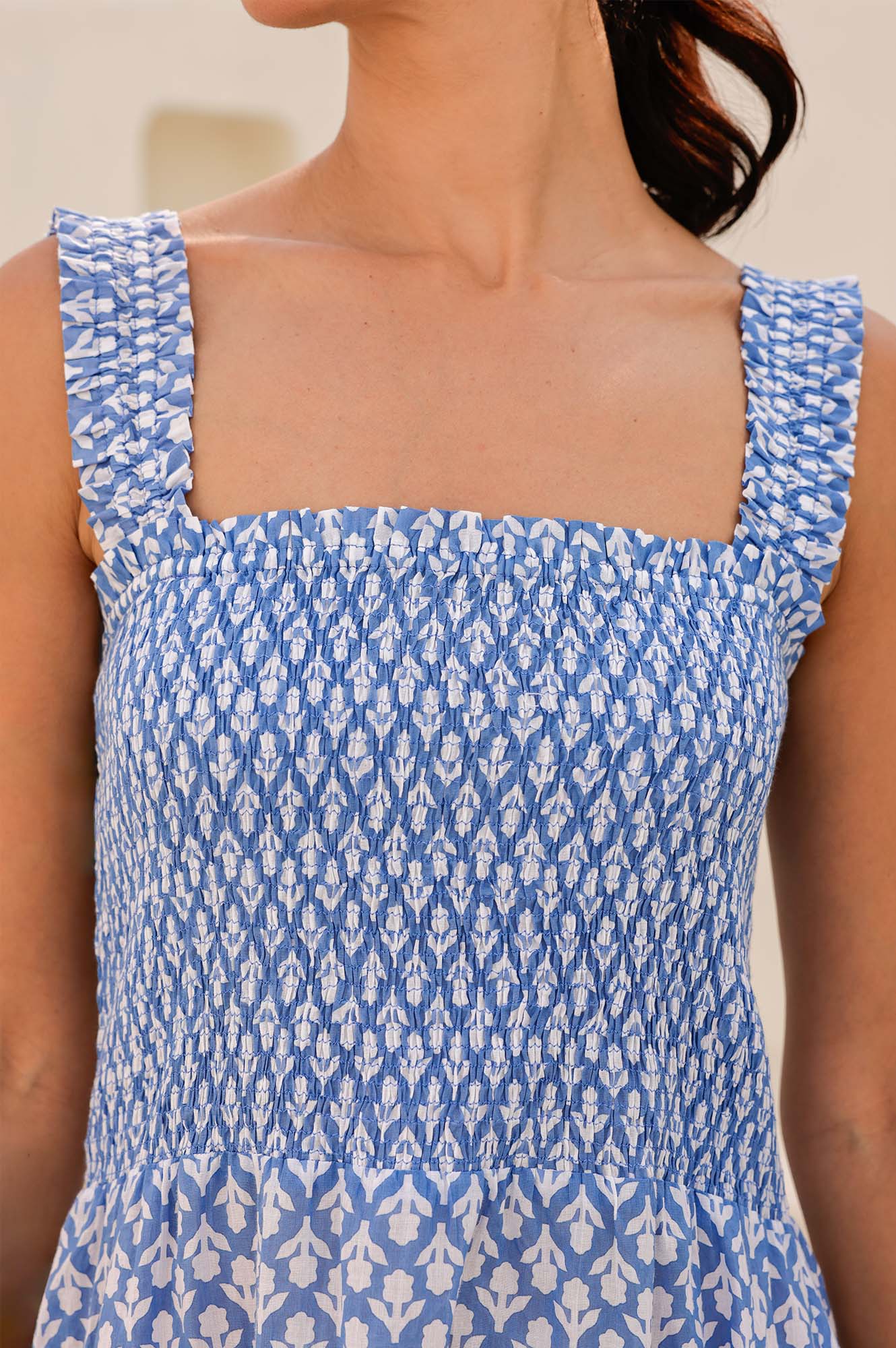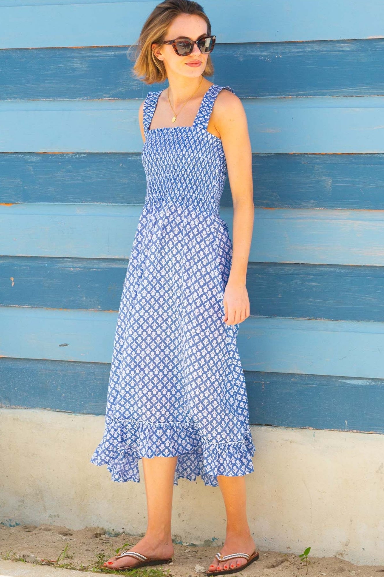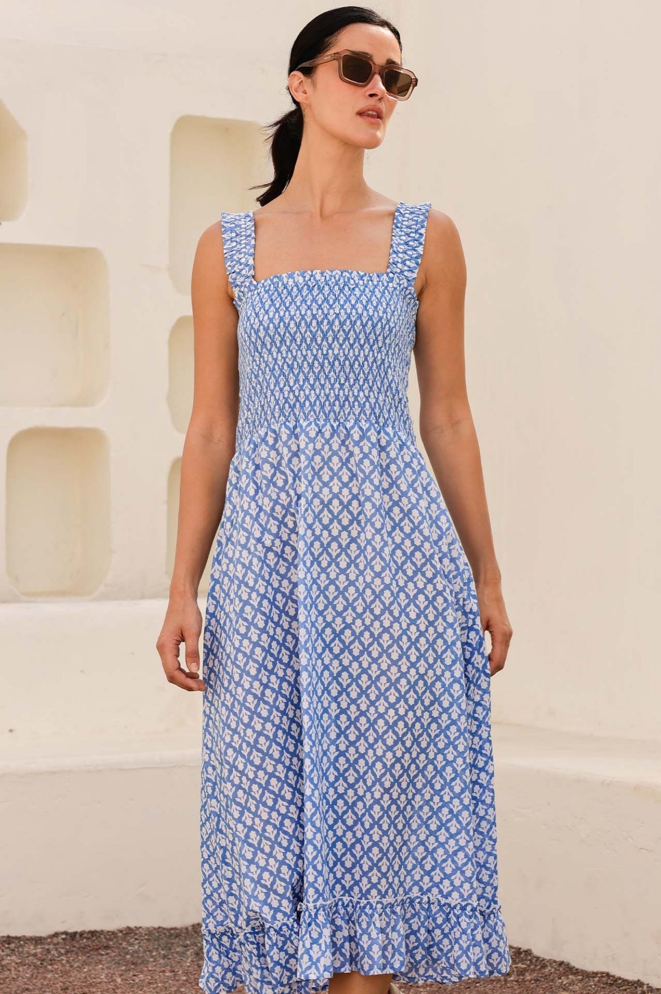 Our Rhianna dress made from soft organic cotton here in one of our new fun prints. Featuring a square neckline, shirred elasticated bodice and straps with frill detailing. Finished with allover flower embroidery and cut to a single-tiered design in a dipped midi length.