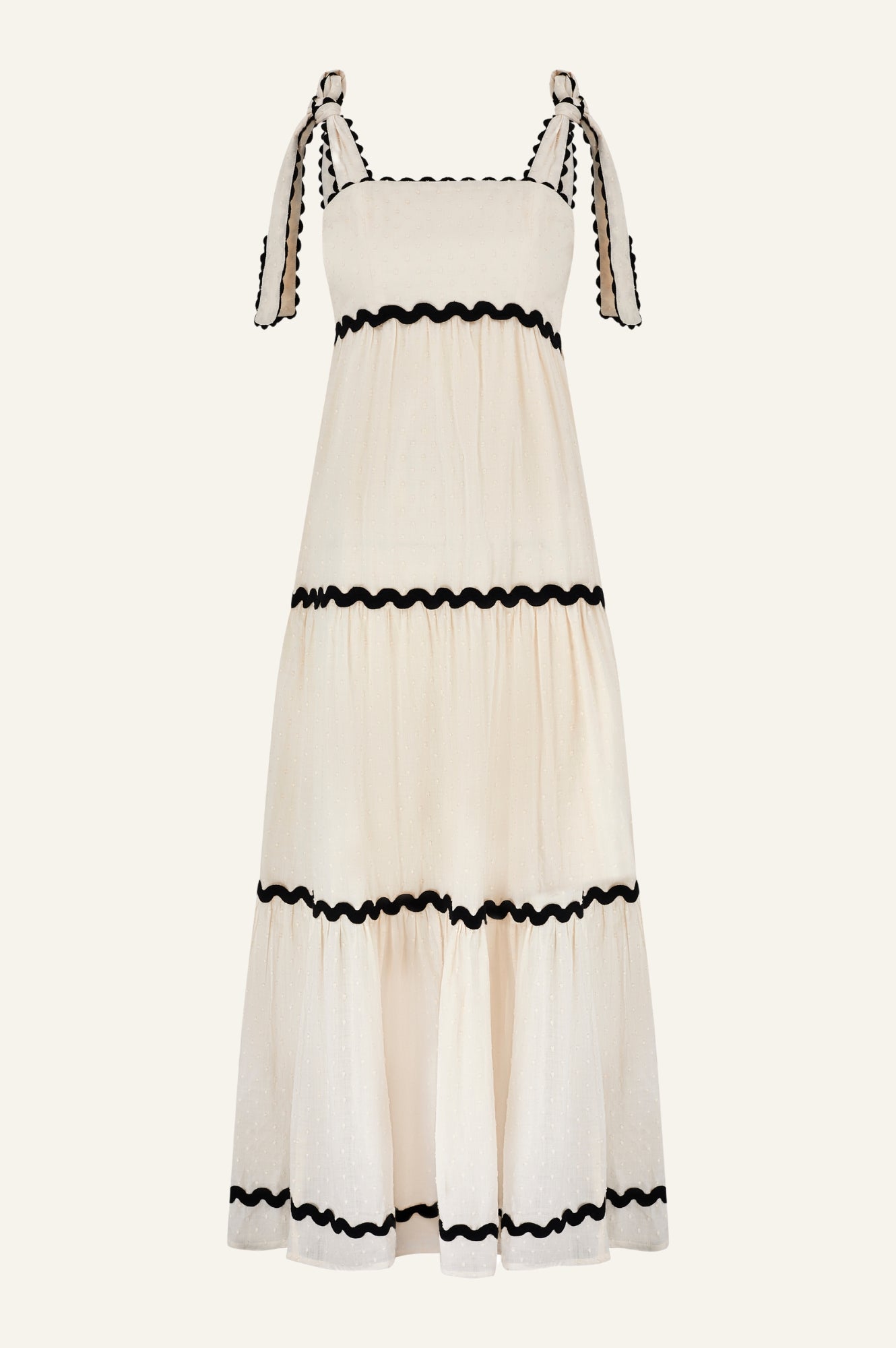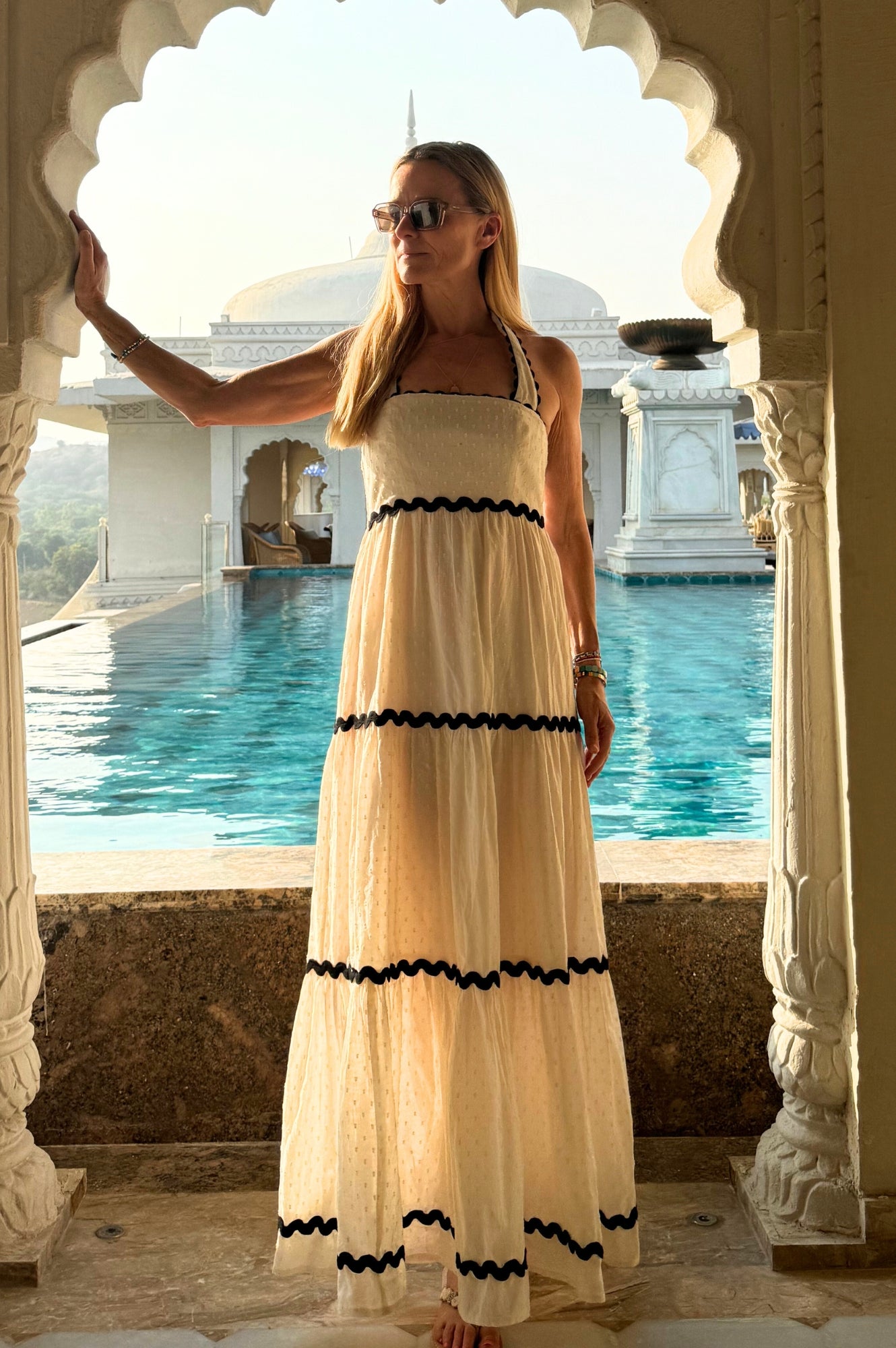 The ultimate elevated sundress, our best-selling Tabitha Dress is now enhanced with bold ric rac trim details. Made from lightweight organic cotton, this piece features wide tie shoulder straps for a relaxed fit. The Tabitha Dress is a full maxi length, designed to flatter all body types with its fixed bodice, shirred back panel, and a flowing fit-and-flare skirt that gently cascades from under the bust. Perfect for warm weather, this dress combines comfort and style effortlessly.