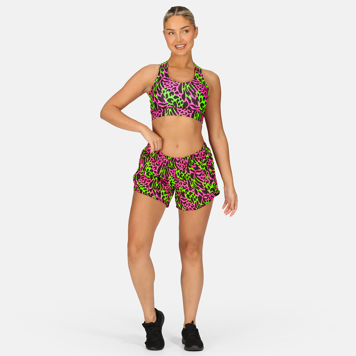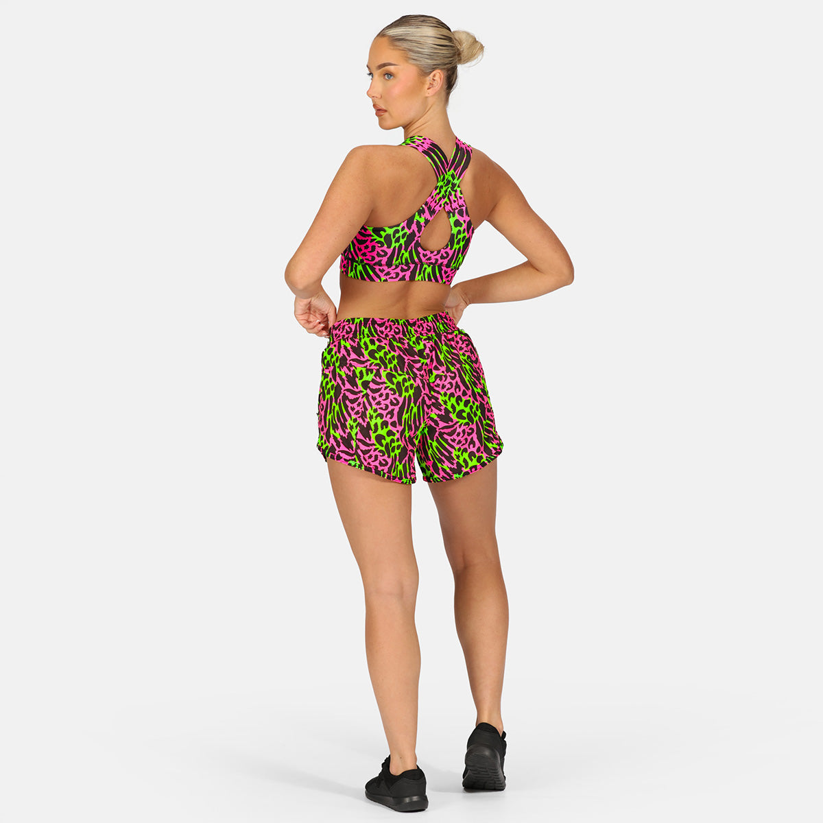 Featuring a bold pink, neon yellow, and black wild cat print, these shorts are perfect for those who love to make a statement. The loose-fit design ensures maximum comfort and freedom of movement, whether you're lifting weights, running, or enjoying a casual day out. The lightweight, breathable fabric keeps you cool and dry, even during the most intense workouts.