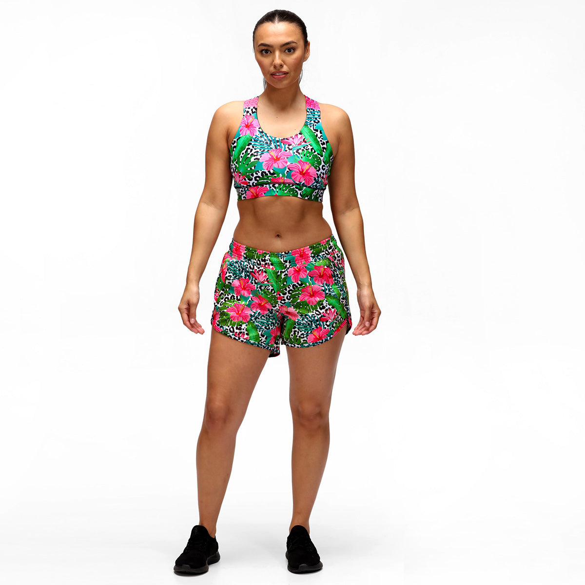 Designed for the modern woman who refuses to compromise on style or comfort, these shorts are a versatile addition to any activewear wardrobe. The bold floral print, set against a backdrop of sleek leopard print, adds a touch of tropical flair to your workout ensemble. With their relaxed fit and breathable fabric, these shorts provide freedom of movement and unparalleled comfort during even the most intense workouts.