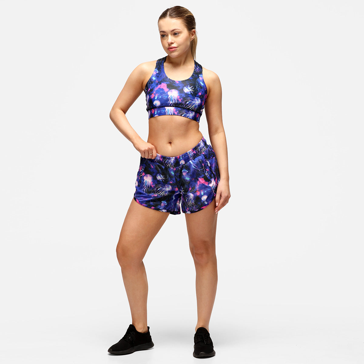 Designed for those who prefer a relaxed silhouette without compromising on style, these shorts offer the perfect blend of comfort and elegance. The captivating galaxy print, adorned with luminous jellyfish, invites you to lose yourself in the wonders of the universe. Made from soft, stretchy fabric, these shorts move with you, whether you're mastering a new yoga pose or simply lounging at home.