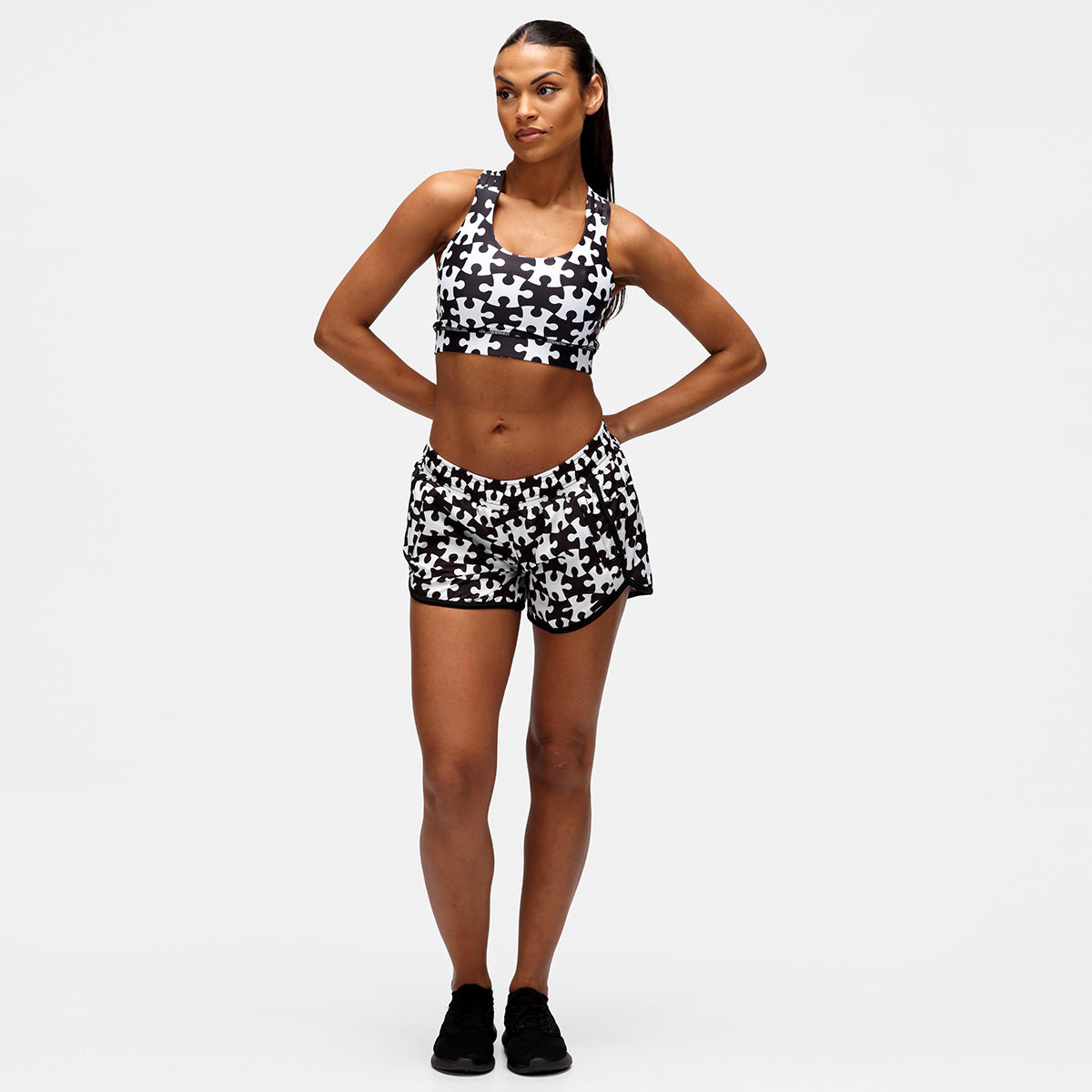 These shorts offer a relaxed fit for maximum comfort and are perfect for those days when you need a little extra room to move. The monochrome jigsaw print adds a touch of elegance to your casual exercise routine.