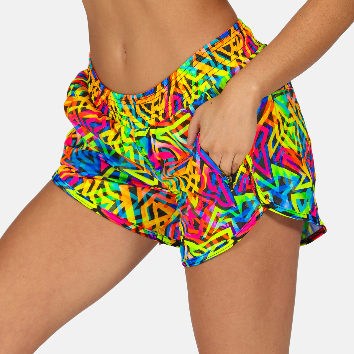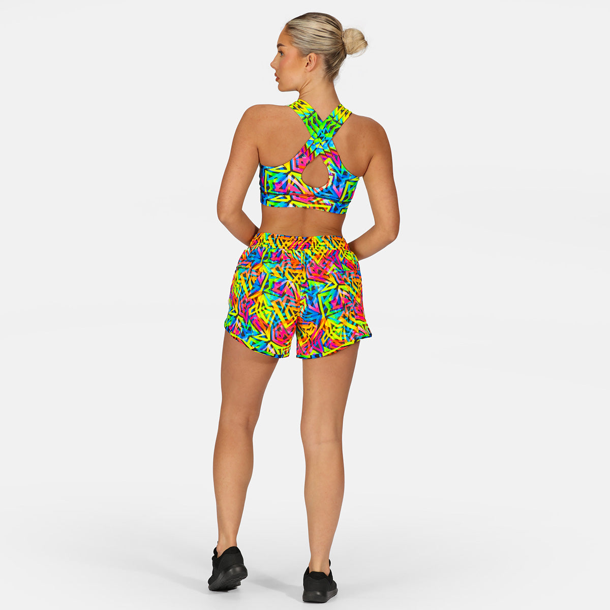 Bursting with neon colours and geometric flair, these shorts redefine activewear aesthetics.
