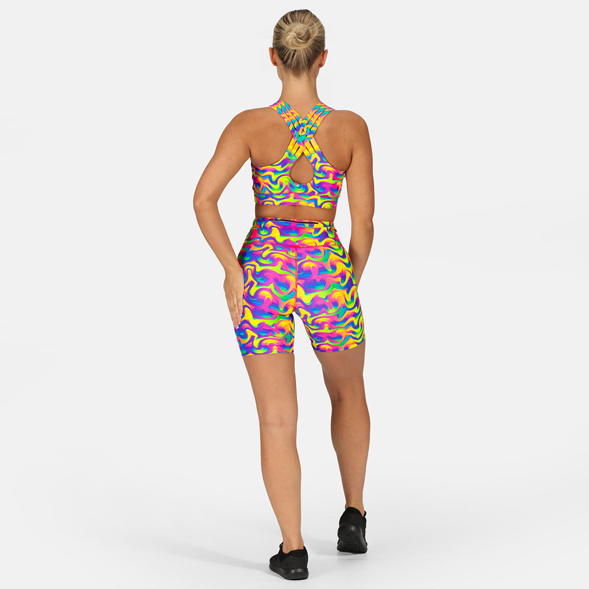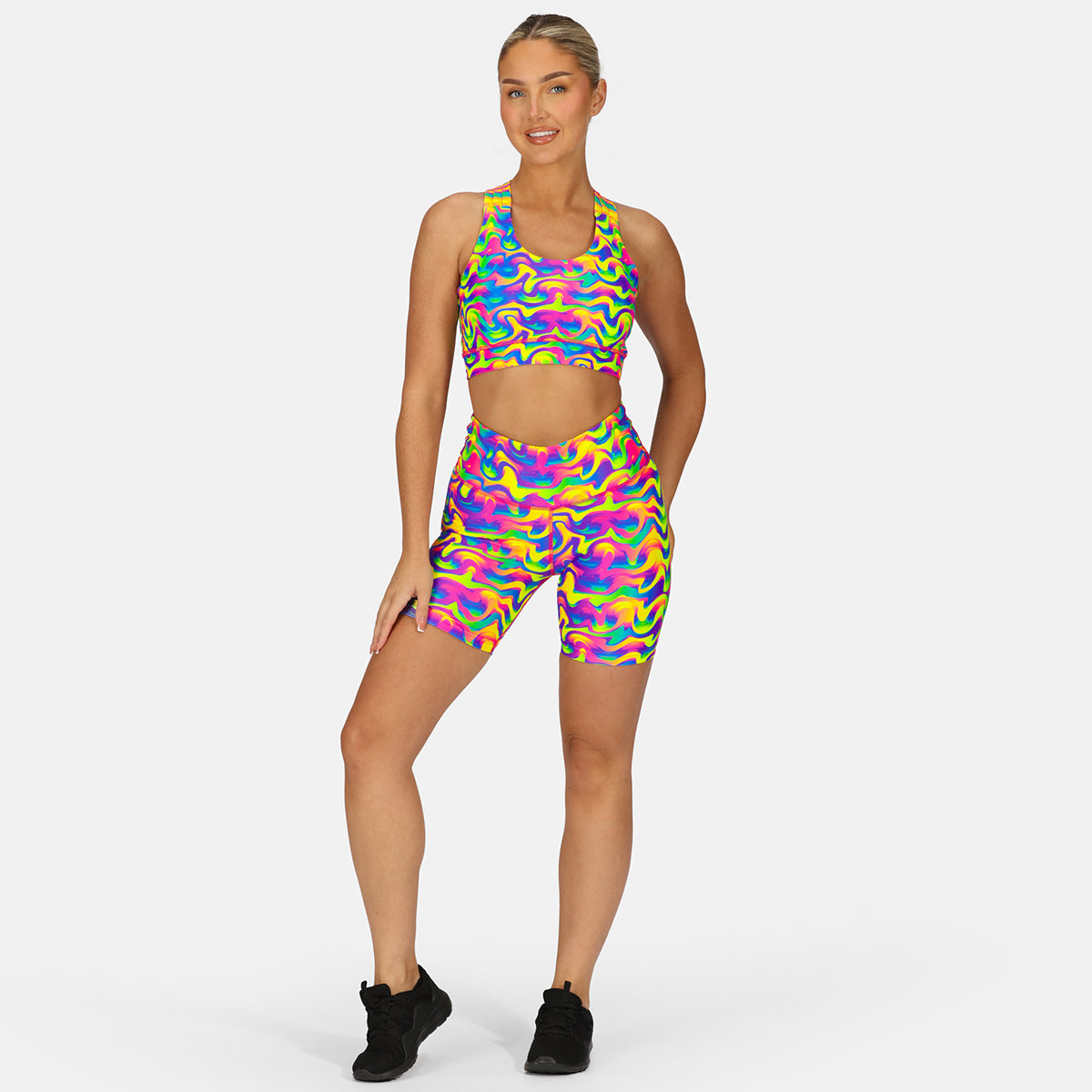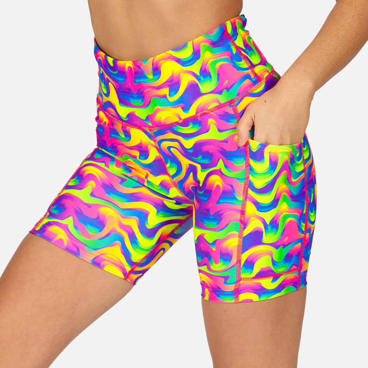 Featuring bold neon waves that harken back to the era of aerobics and track suits, these shorts are sure to make a statement on the pavement or the treadmill. The moisture-wicking fabric and built-in briefs offer comfort and support, while the retro-inspired print adds a fun pop of colour to your workout ensemble.