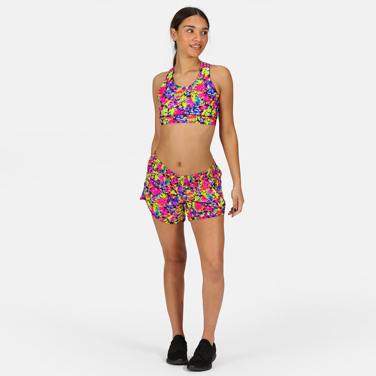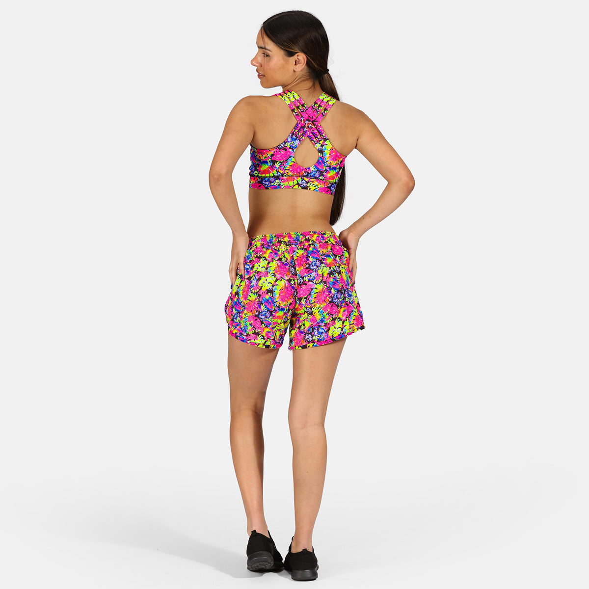 Designed for comfort and style, these shorts feature a dynamic mix of rainbow neon colours against a backdrop of darkness, reminiscent of a lively tropical garden.
