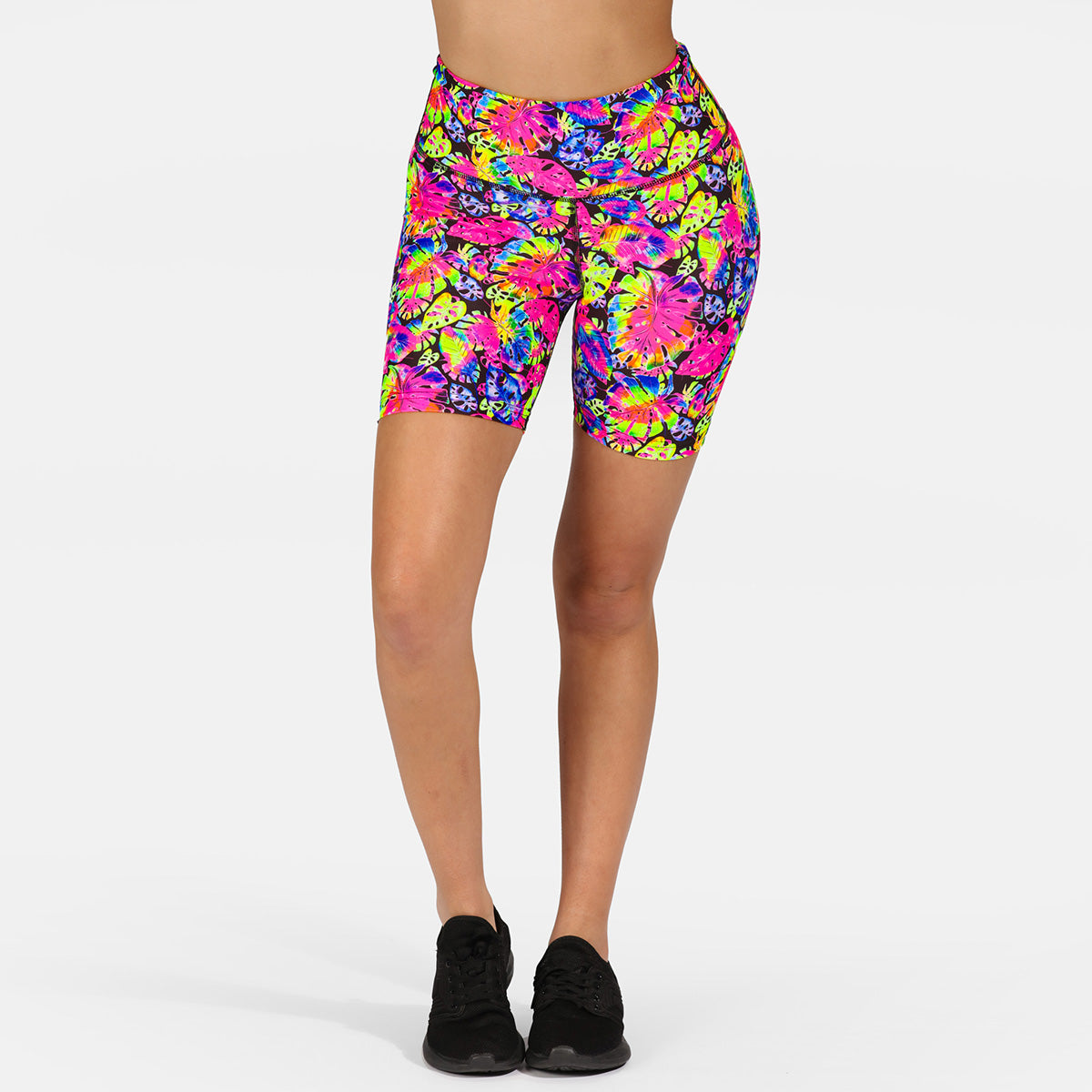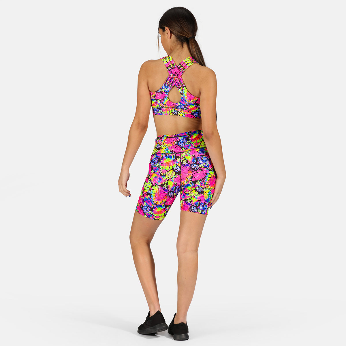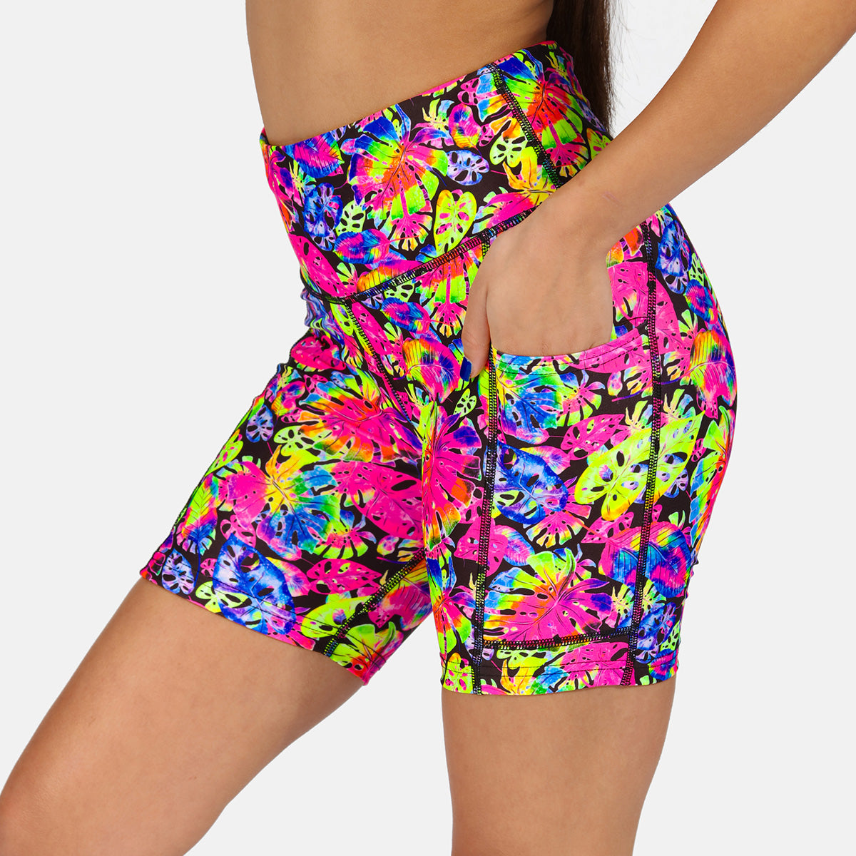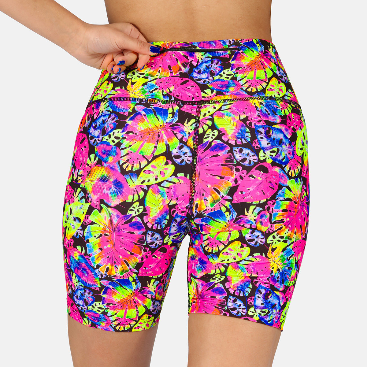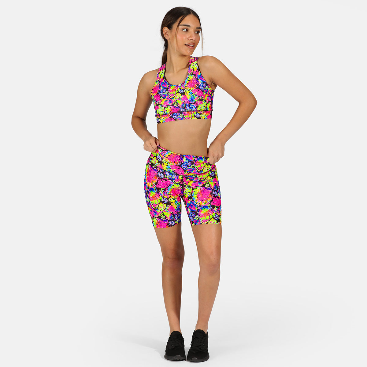 These shorts are a vibrant expression of your active lifestyle, featuring a burst of rainbow neon colours against a sleek black background.