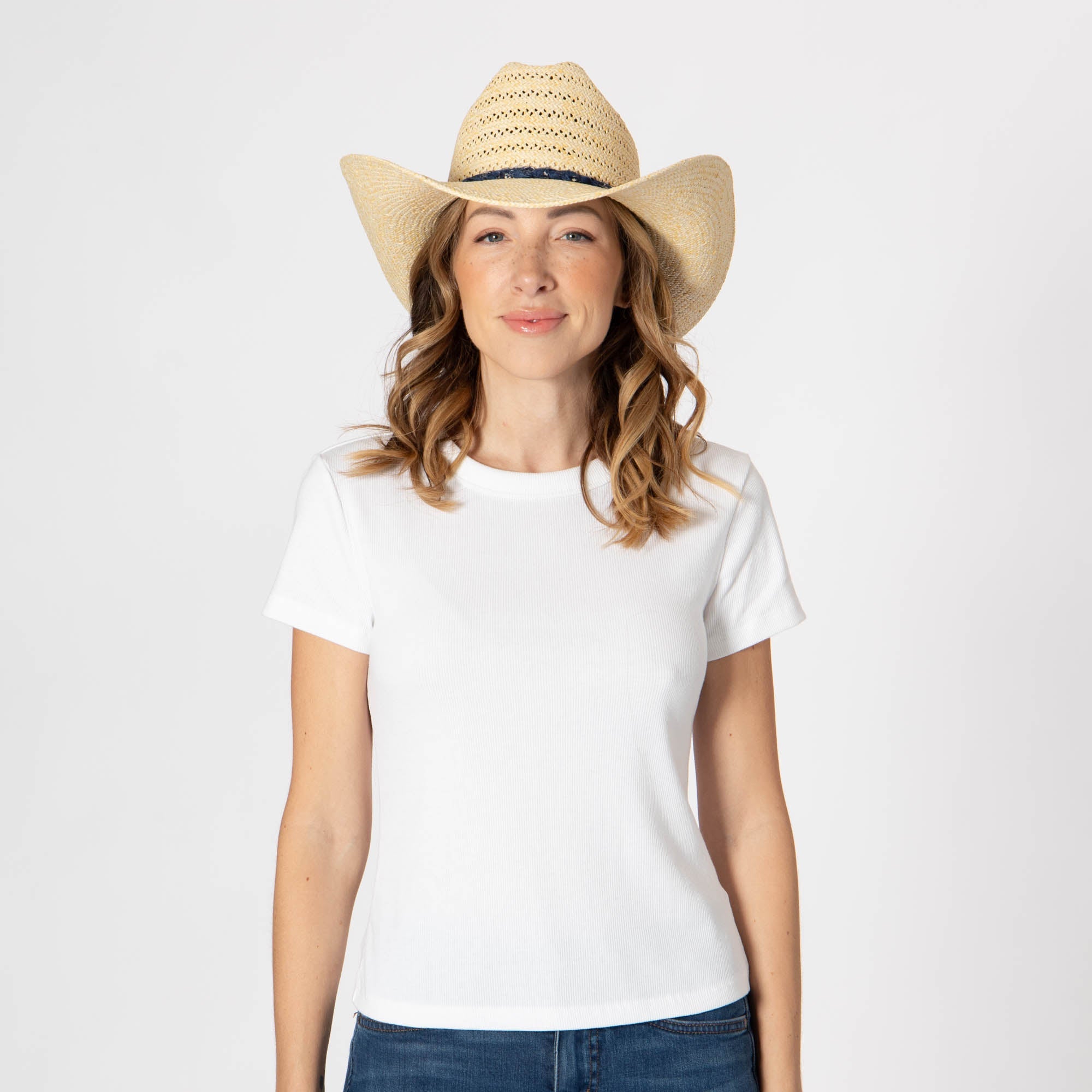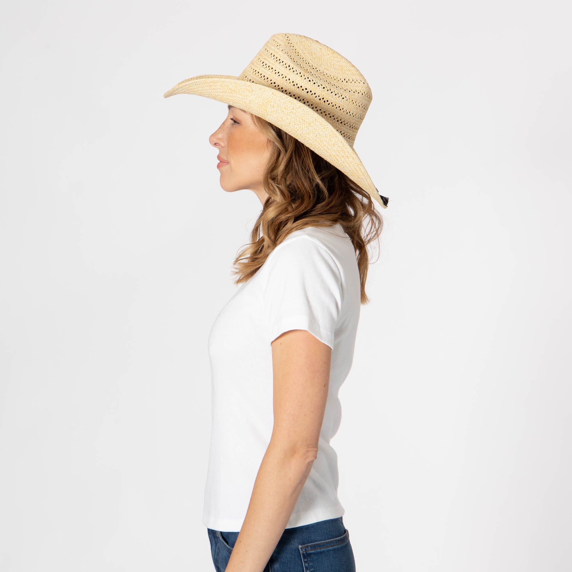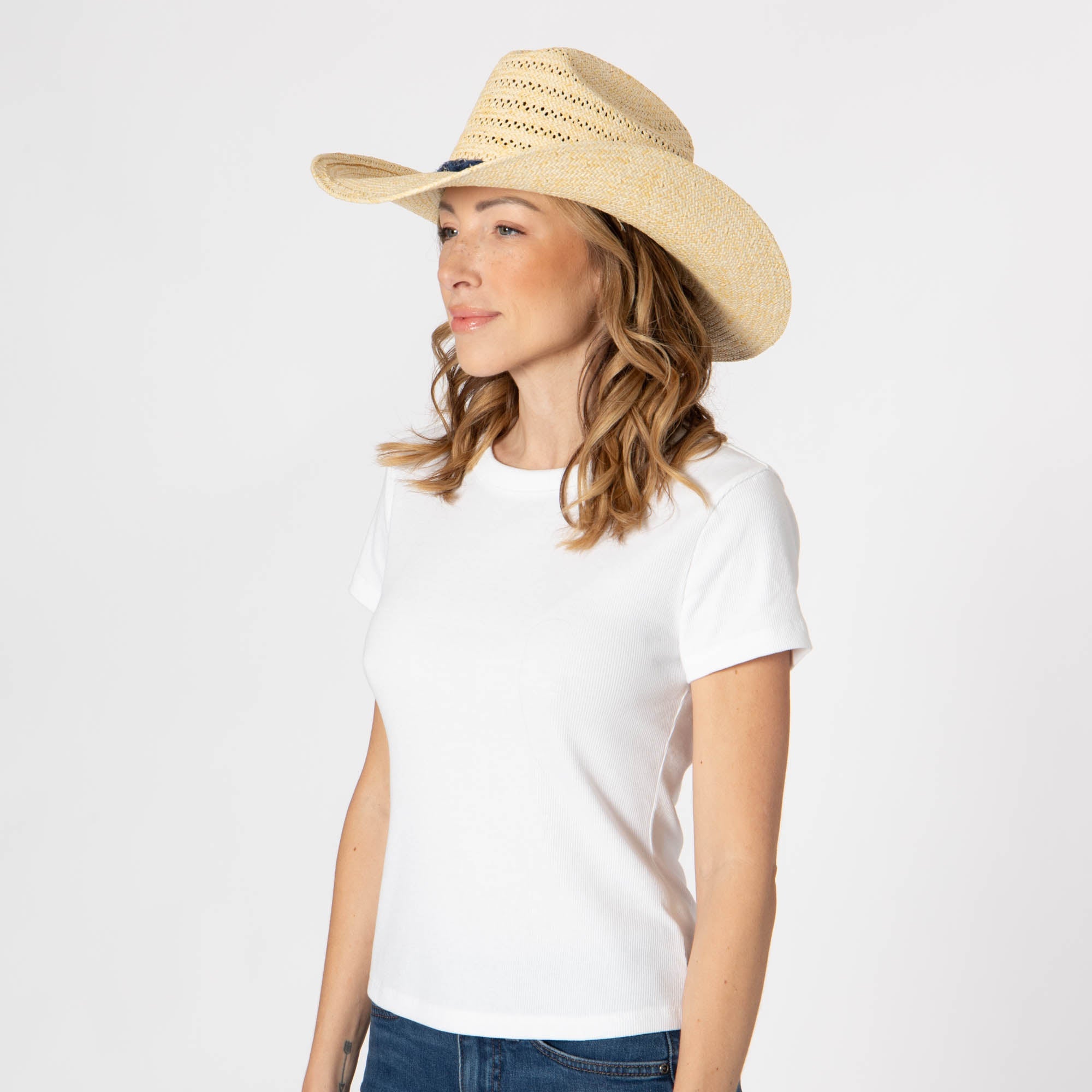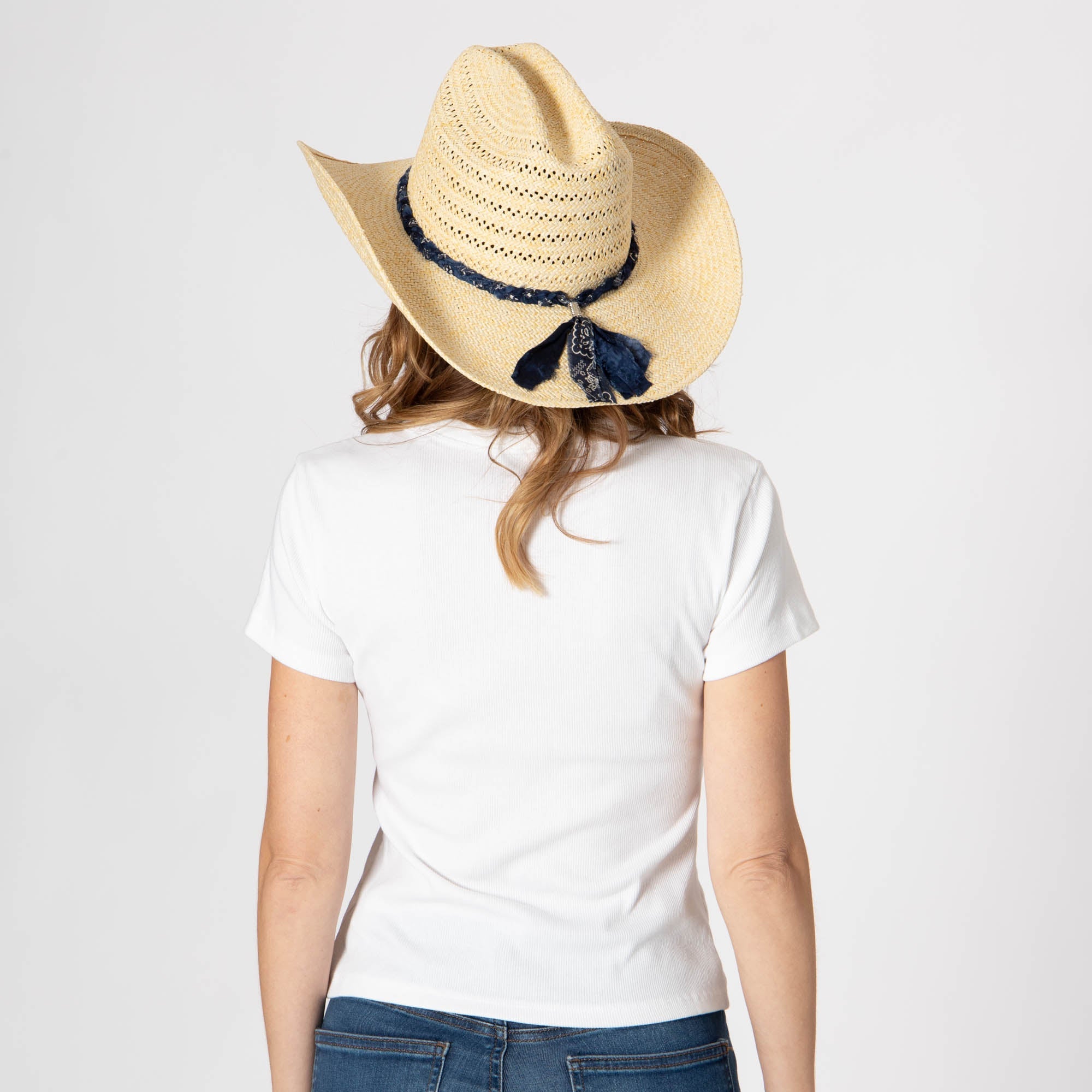 Ride into style with Annie, the woven toyo straw cowboy hat with a wire brim for flexibility and UPF 50+ sun protection. The braided distressed bandana band adds a touch of whimsy and is adjustable for the perfect fit.