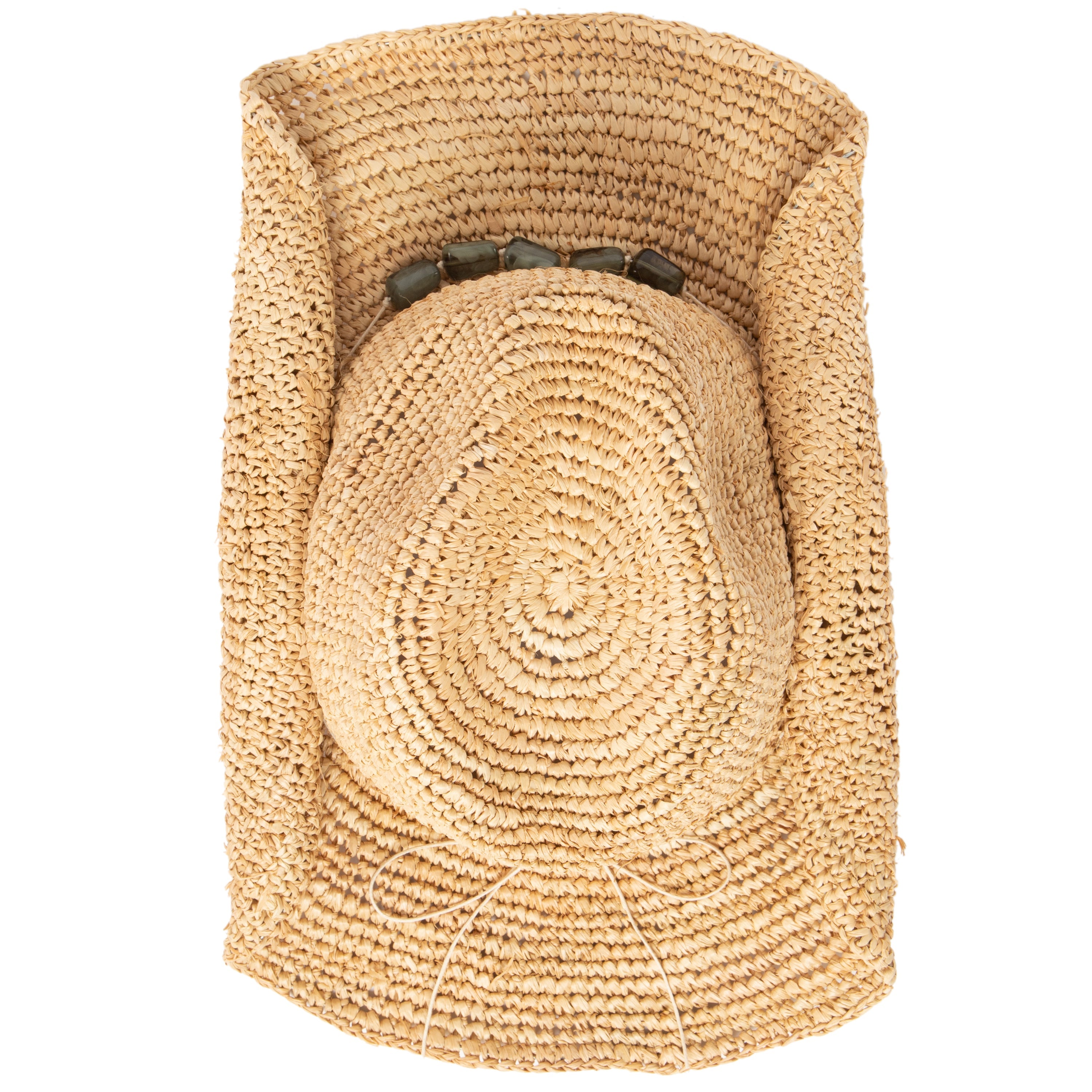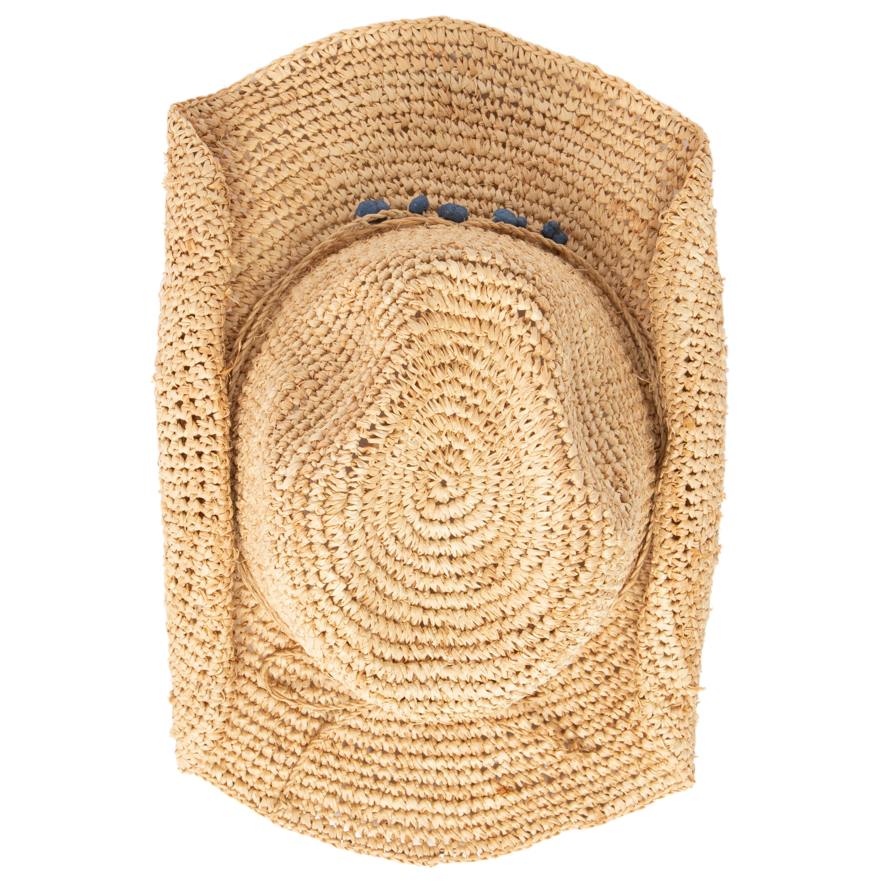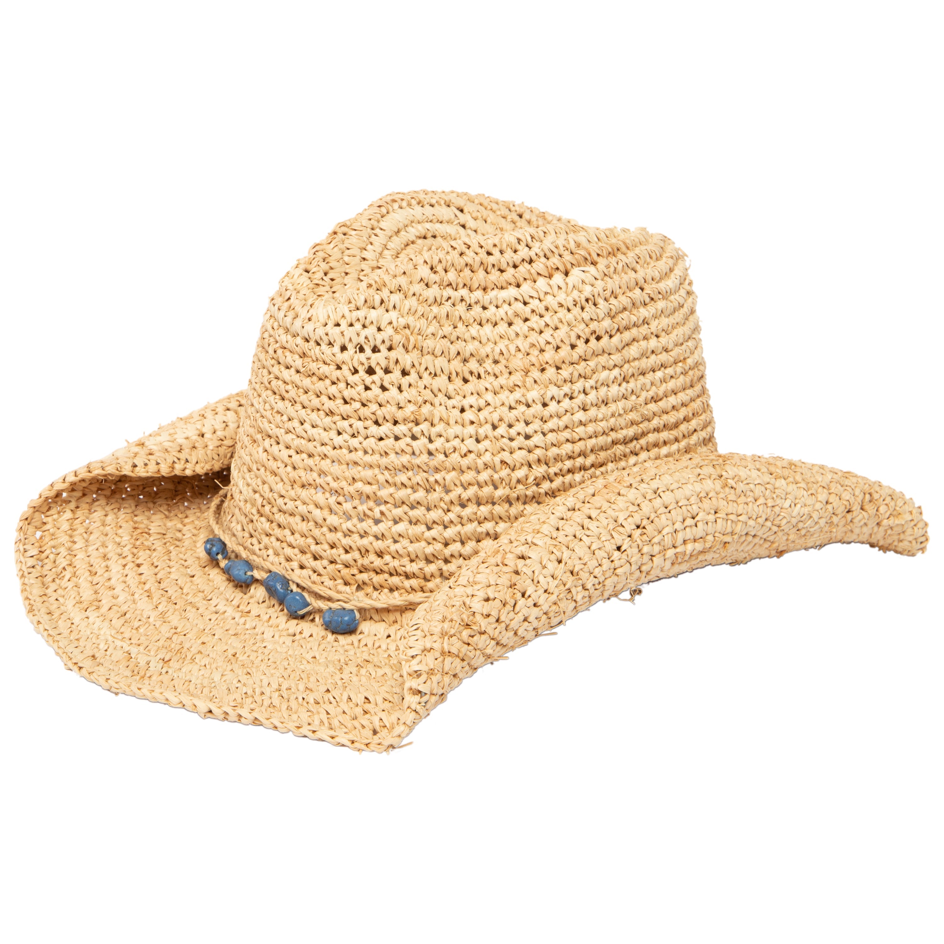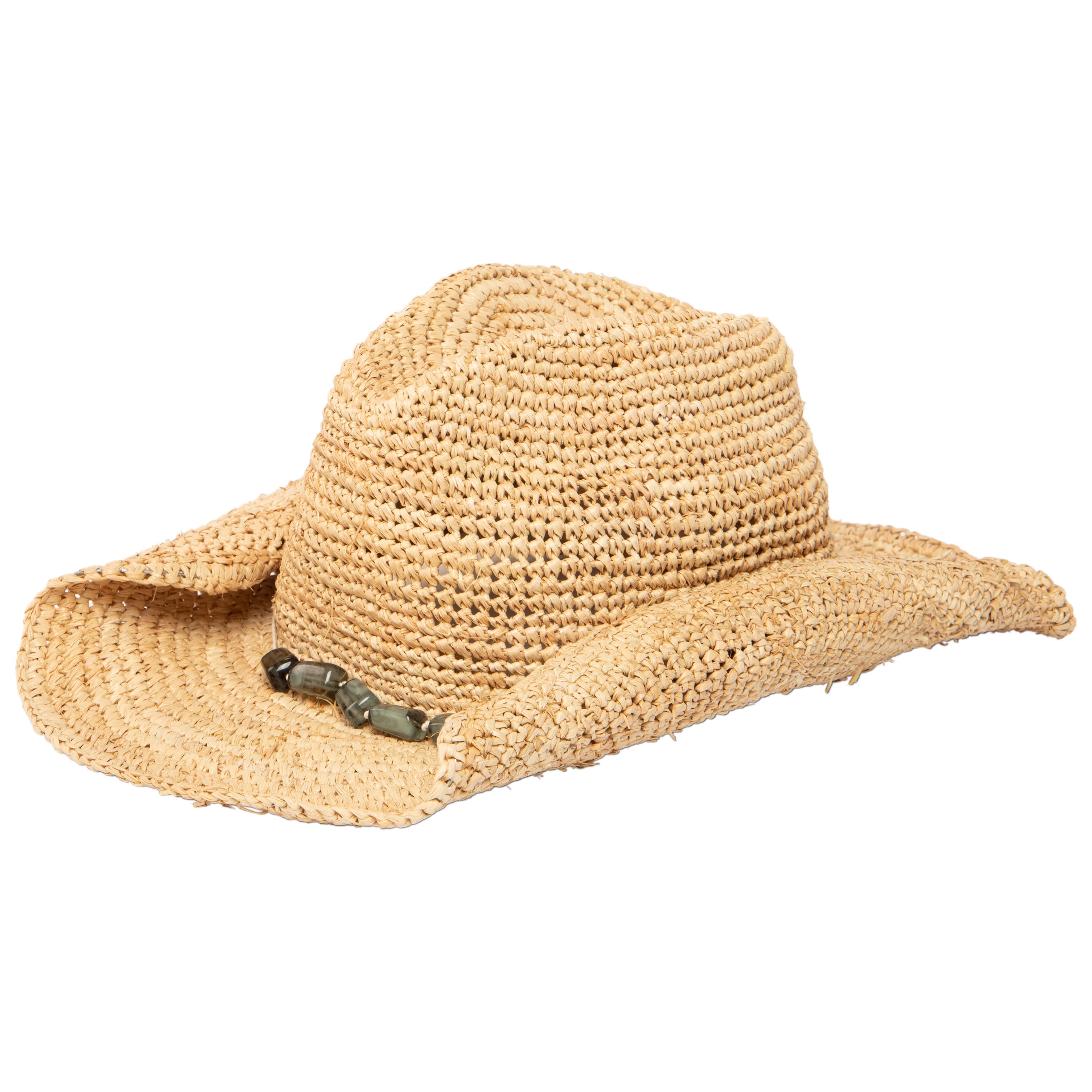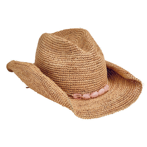 Stay cool and protected while listening to your favorite music! As a music festival favorite, this cowboy can be paired with a number of outfits thanks to its different beads. This cowboy hat with stone trim features a 3.25' brim and is crafted of 100% raffia.