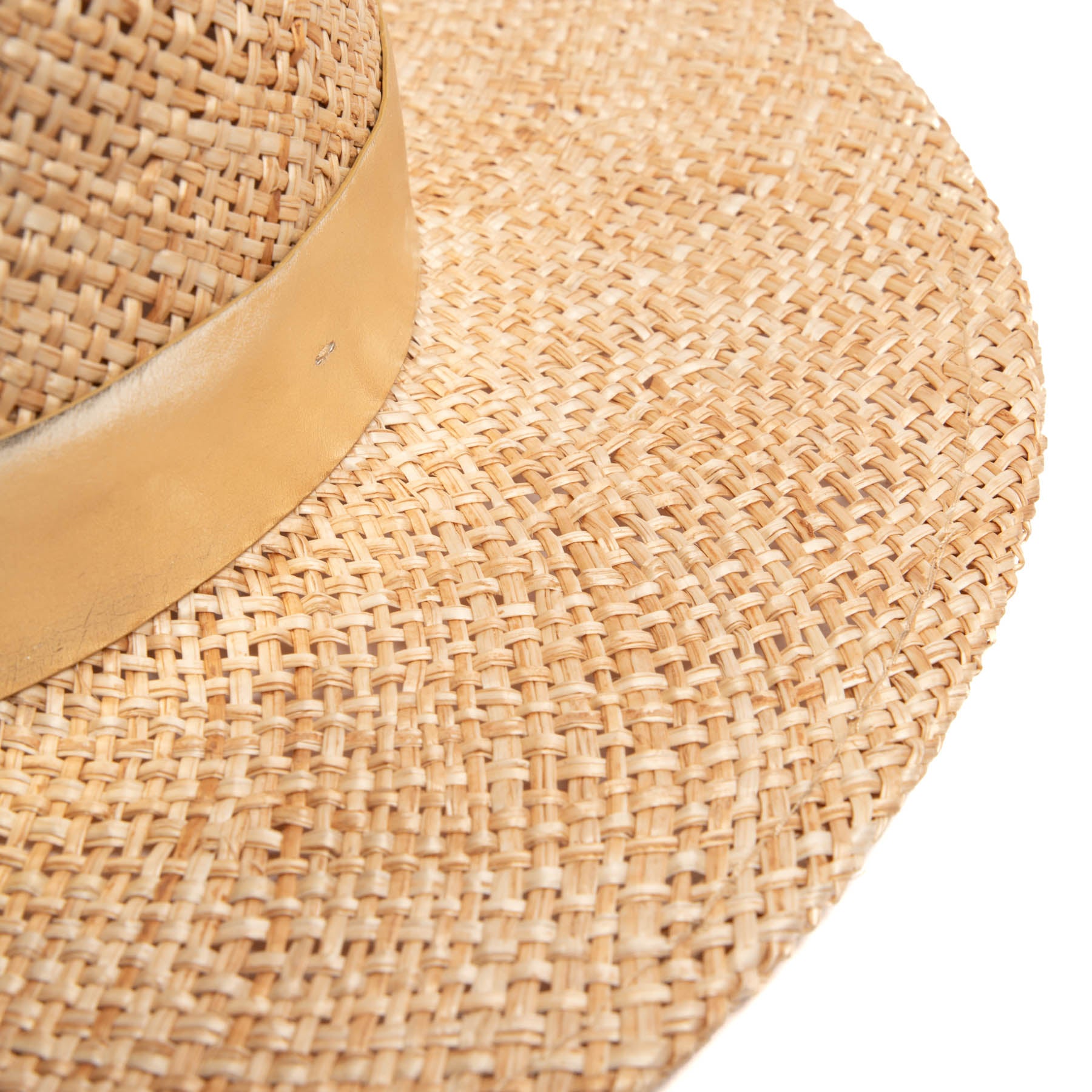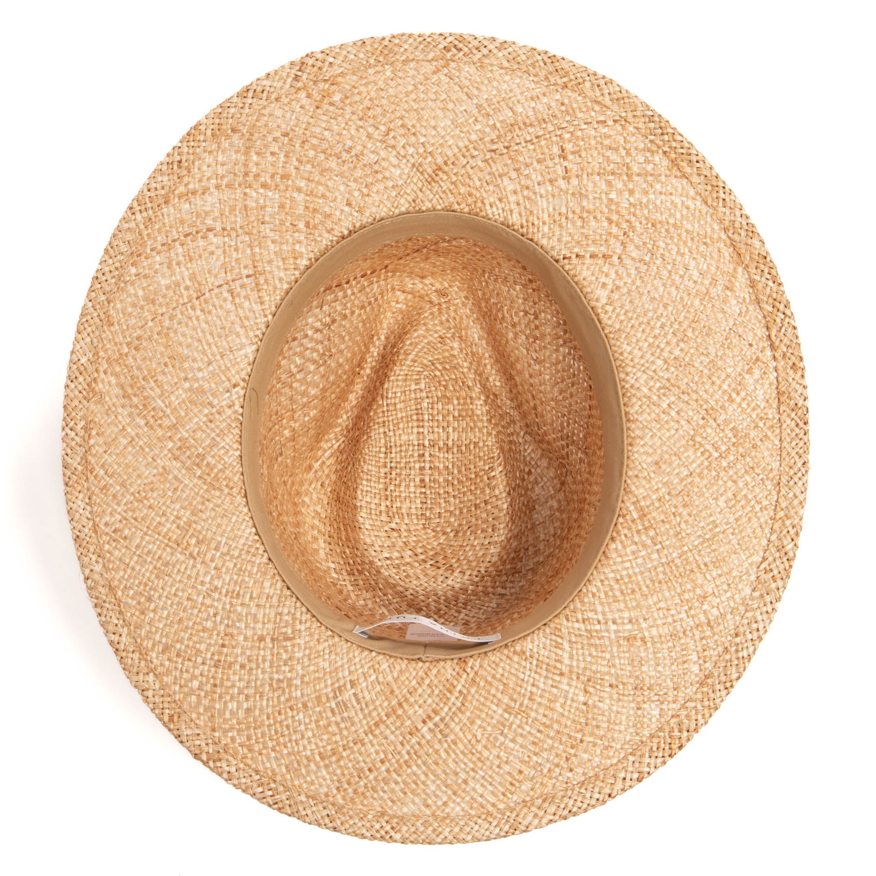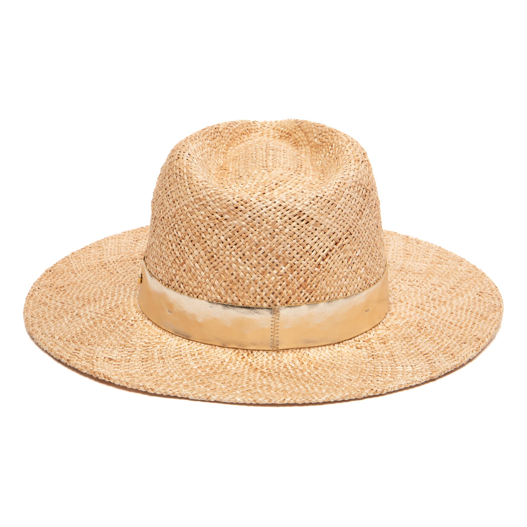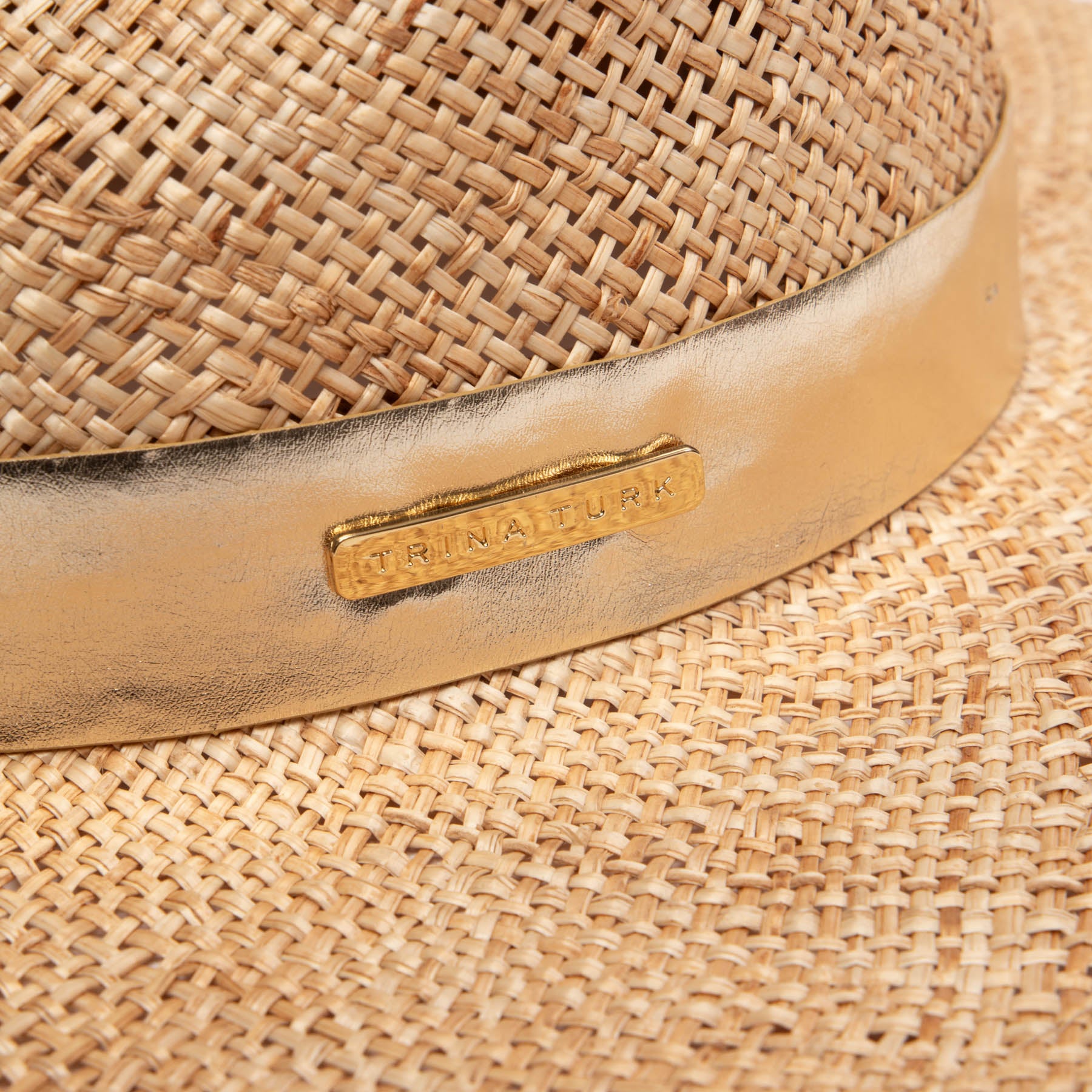 Indulge in the luxurious Kyle Fedora by Trina Turk (TRT1026). This woven sisal fedora boasts a gold vegan leather band and polished metal logo plaque for a sophisticated touch. The 3.25' brim offers both style and sun protection. Made from 100% Sisal Straw, this adjustable fedora is a must-have for any fashion-forward individual.