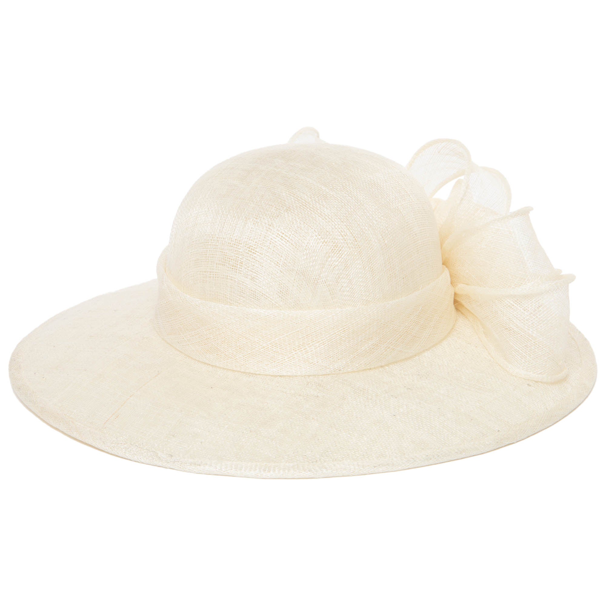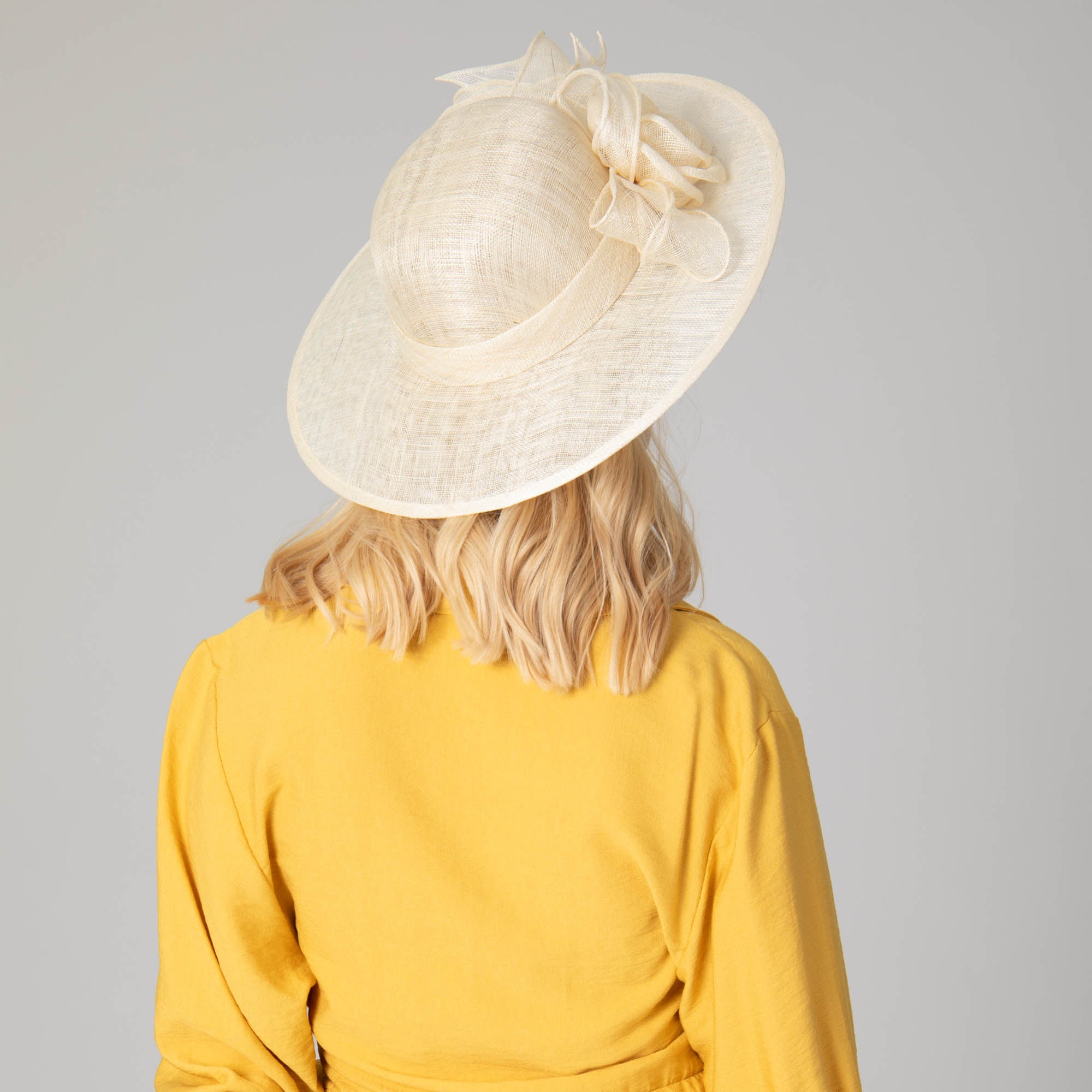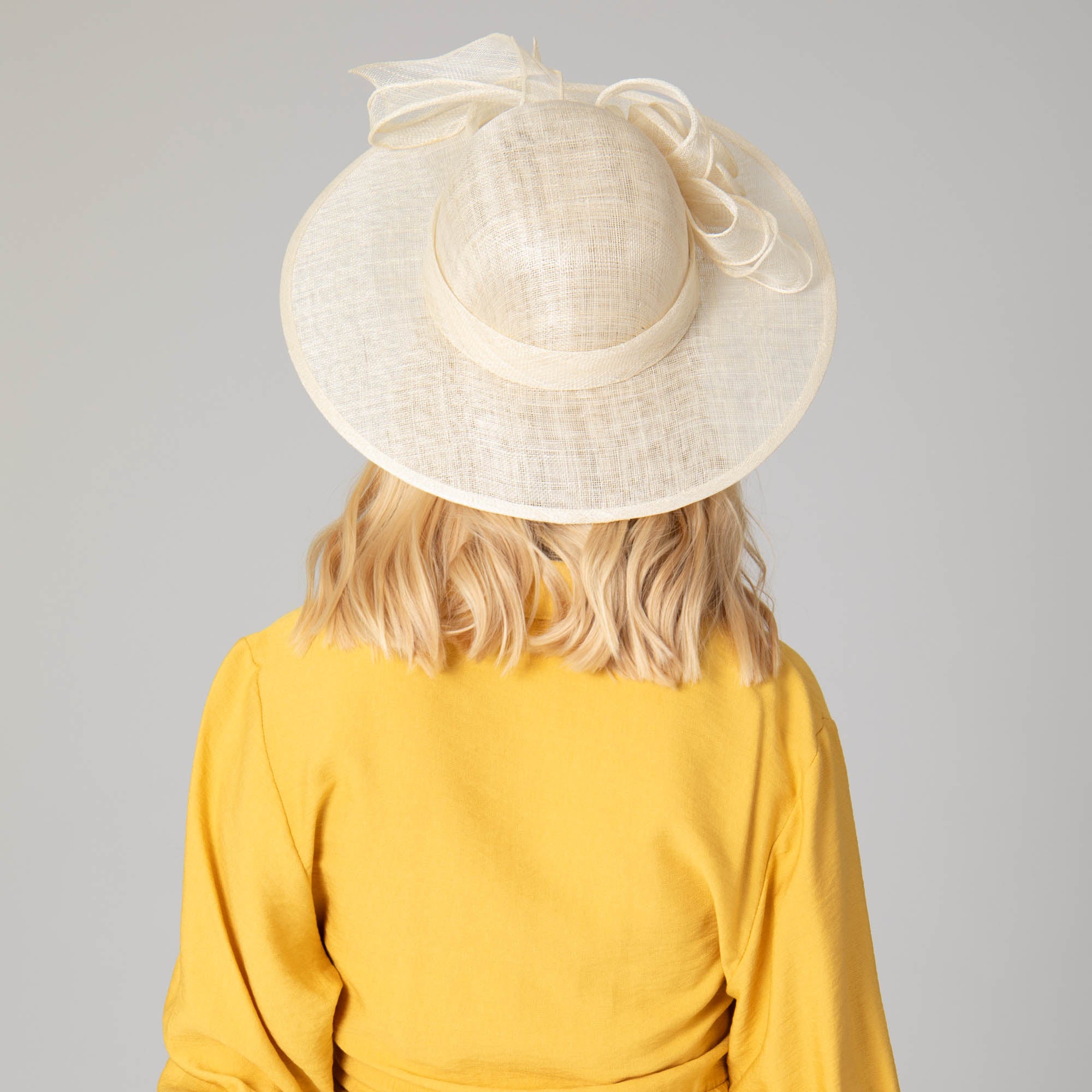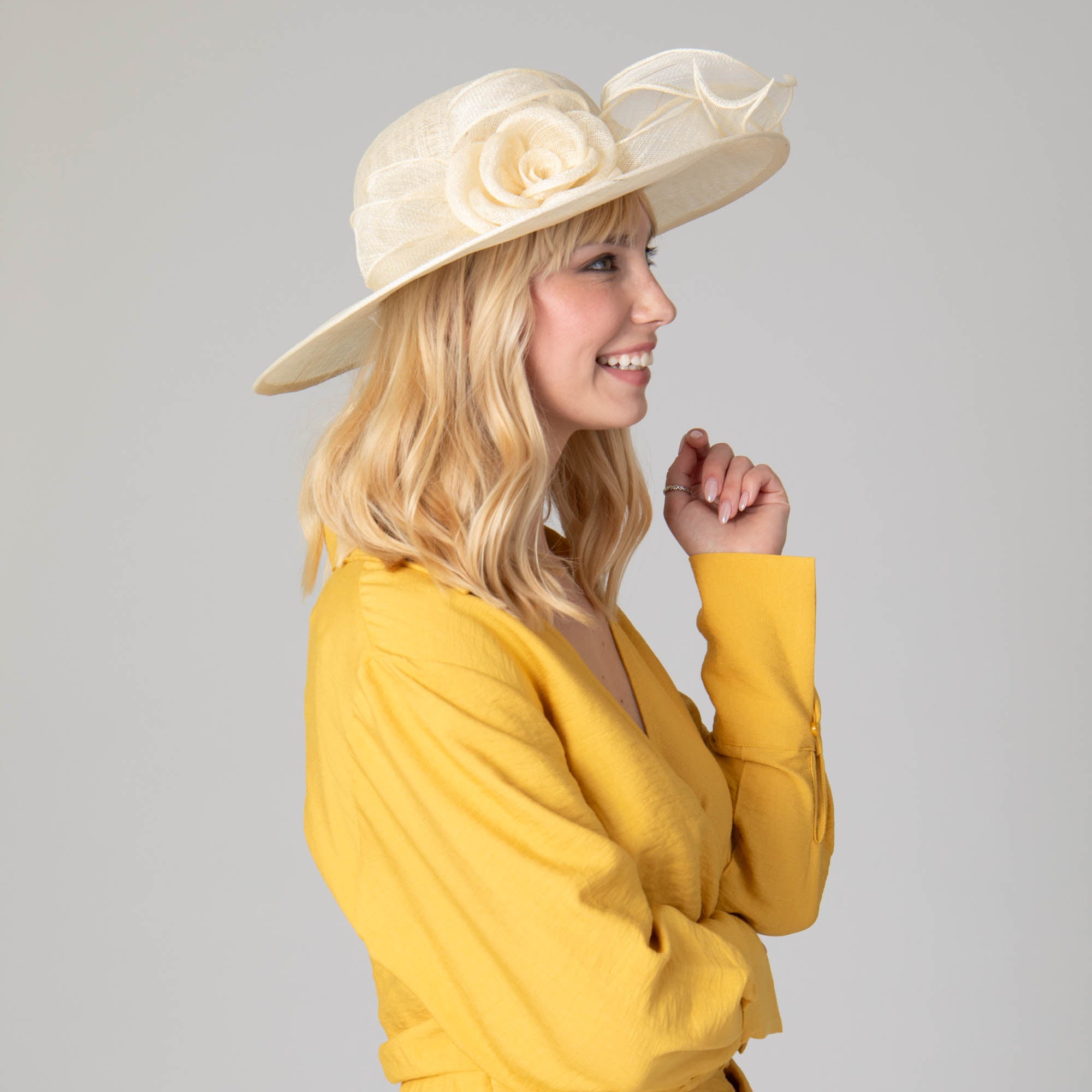 This 100% Sinamay dressy hat in a lovely ivory color features a self floral band and a 4' brim size. With its elegant design and high-quality material, this hat is sure to add a touch of sophistication to any outfit. Perfect for special occasions or elevating your everyday style.