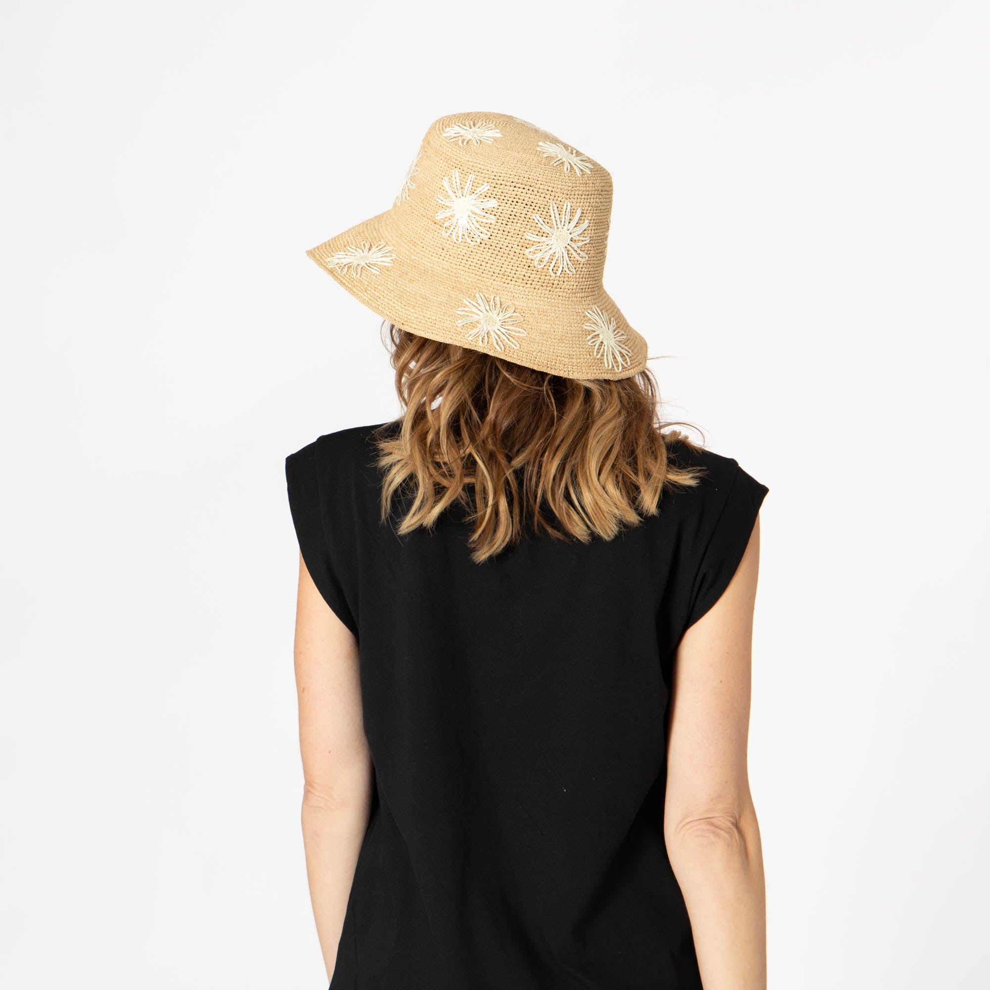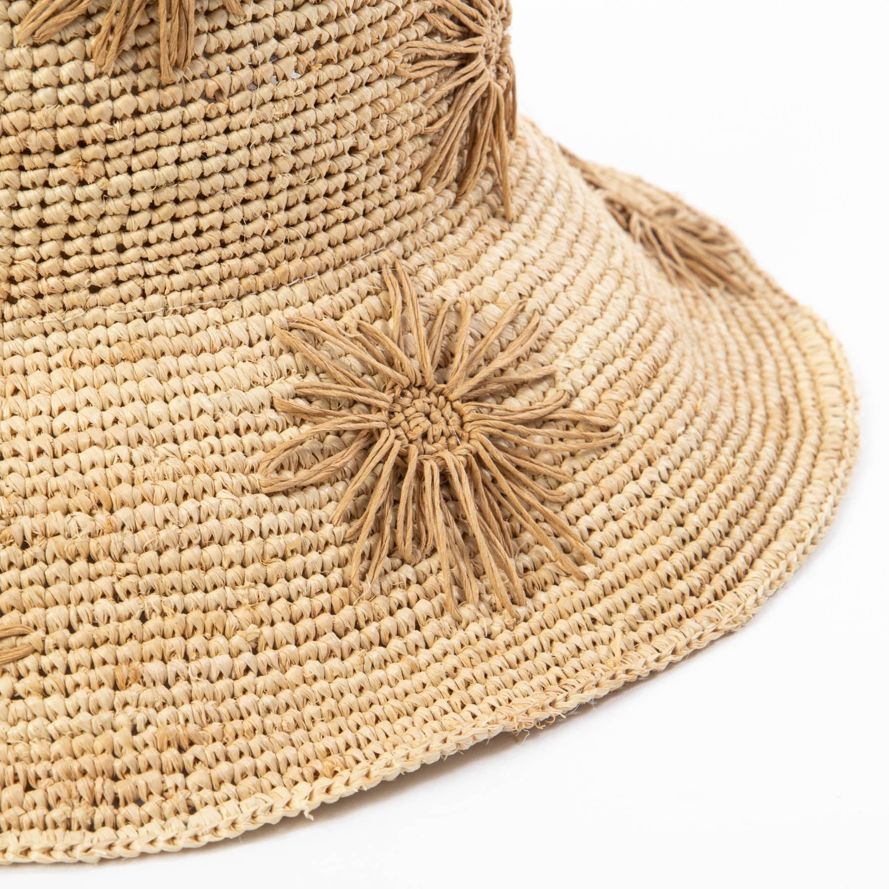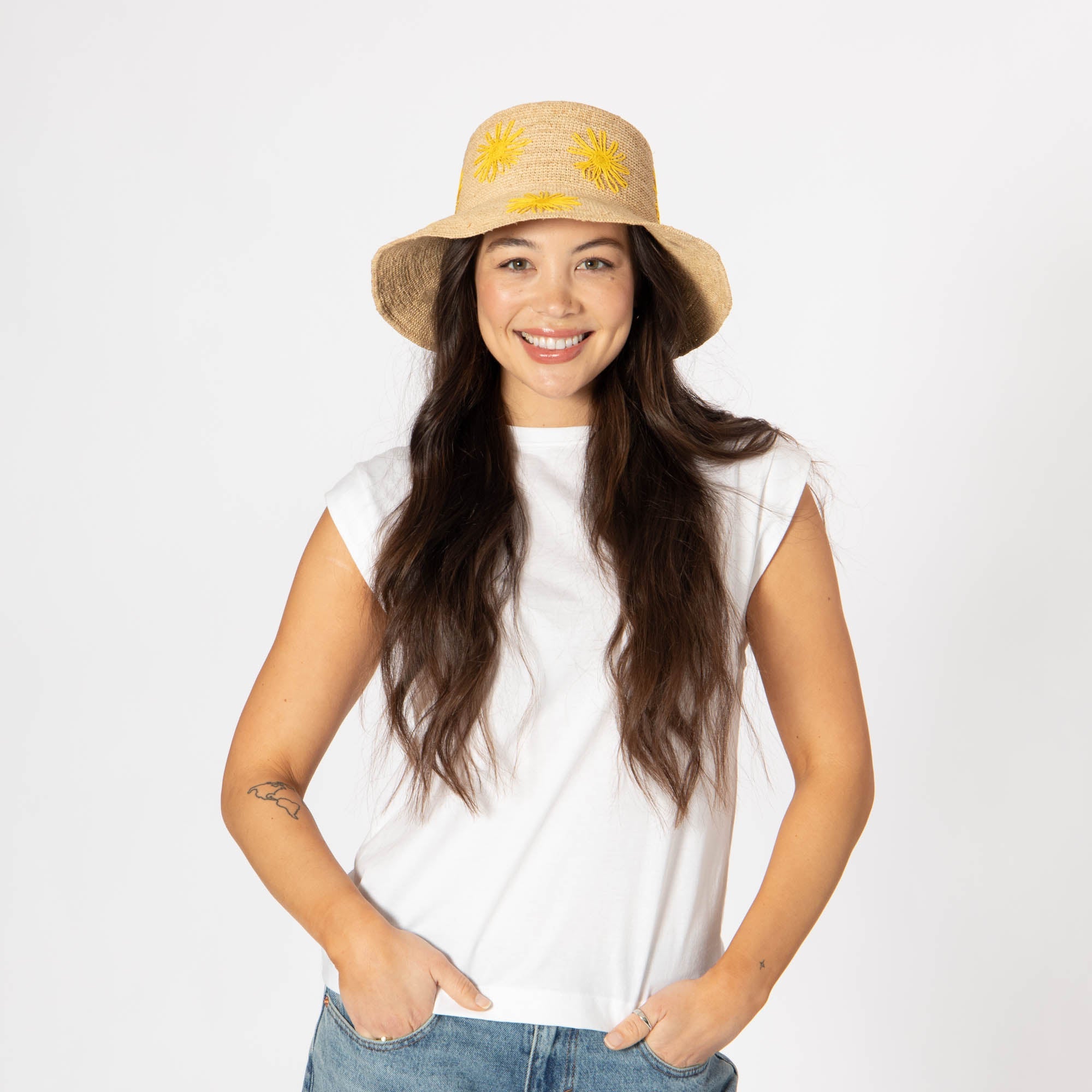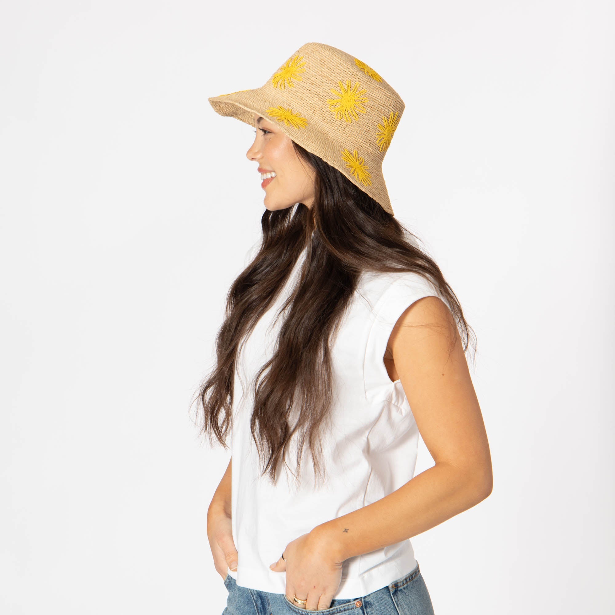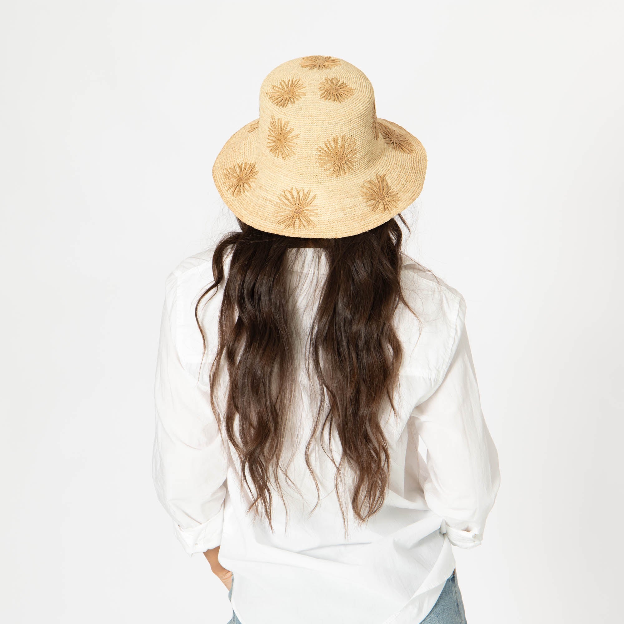 Stay stylish and protected with our Sol - Crochet Raffia Bucket hat! Made from 100% raffia, it features a 3.5' brim and UPF 50+ sun protection. The colorful embroidered flowers add a playful touch, and with adjustable sizing, you'll have the perfect fit. Available in tan, white, or yellow.