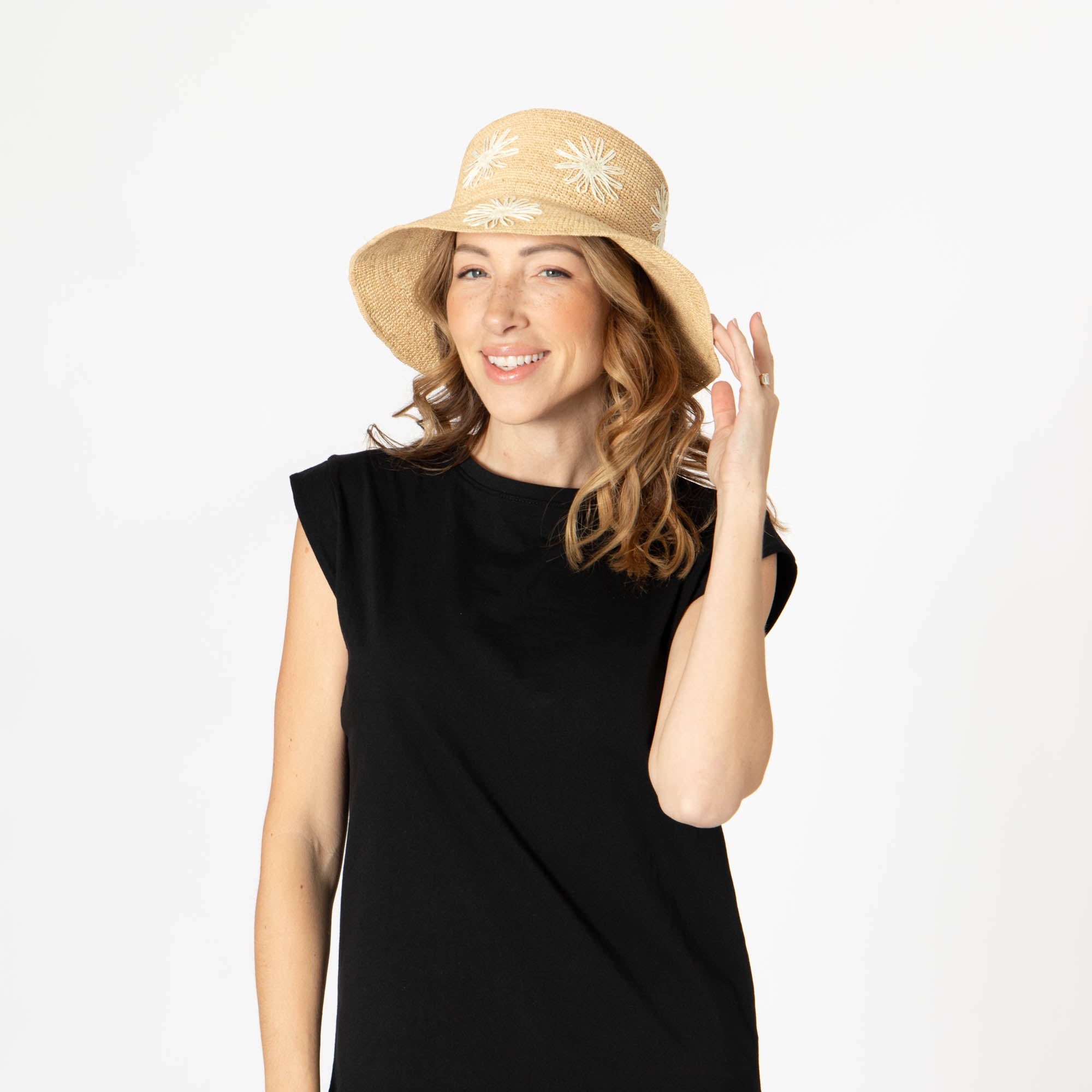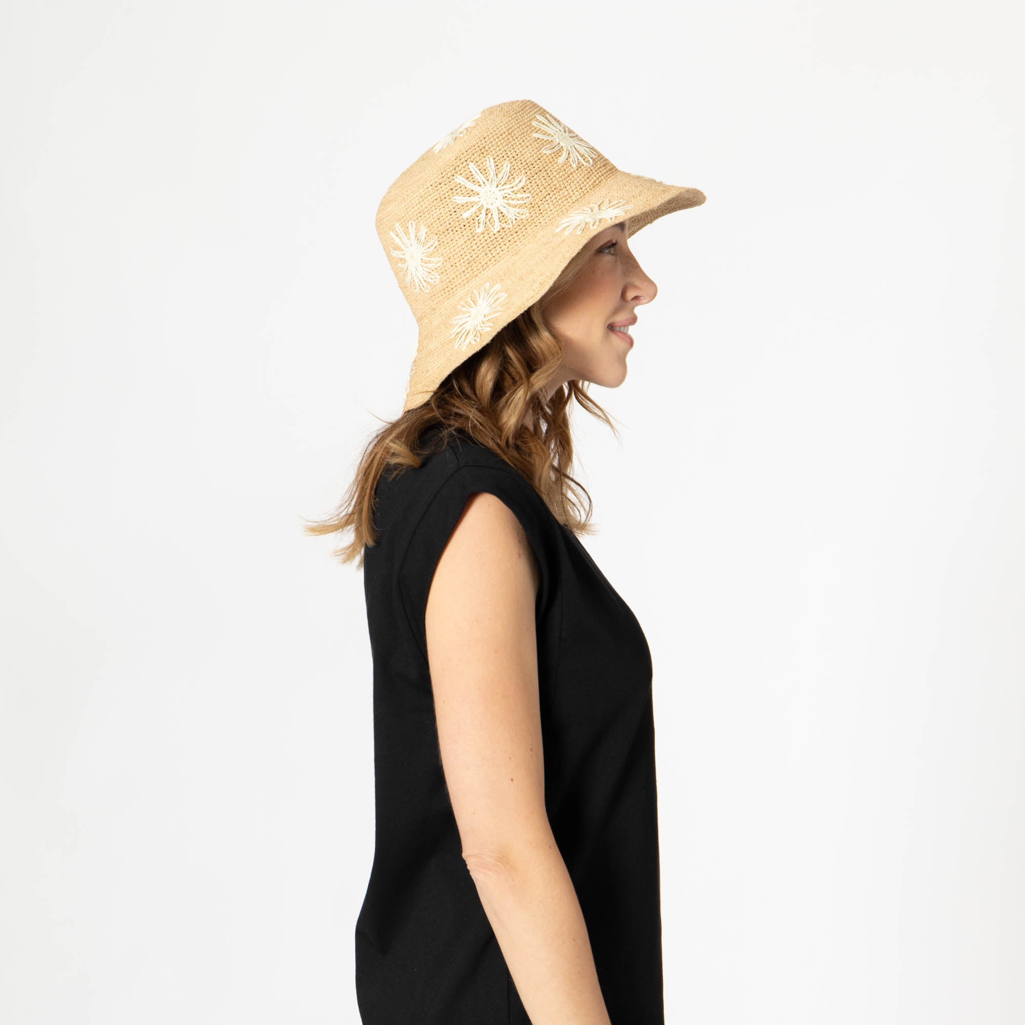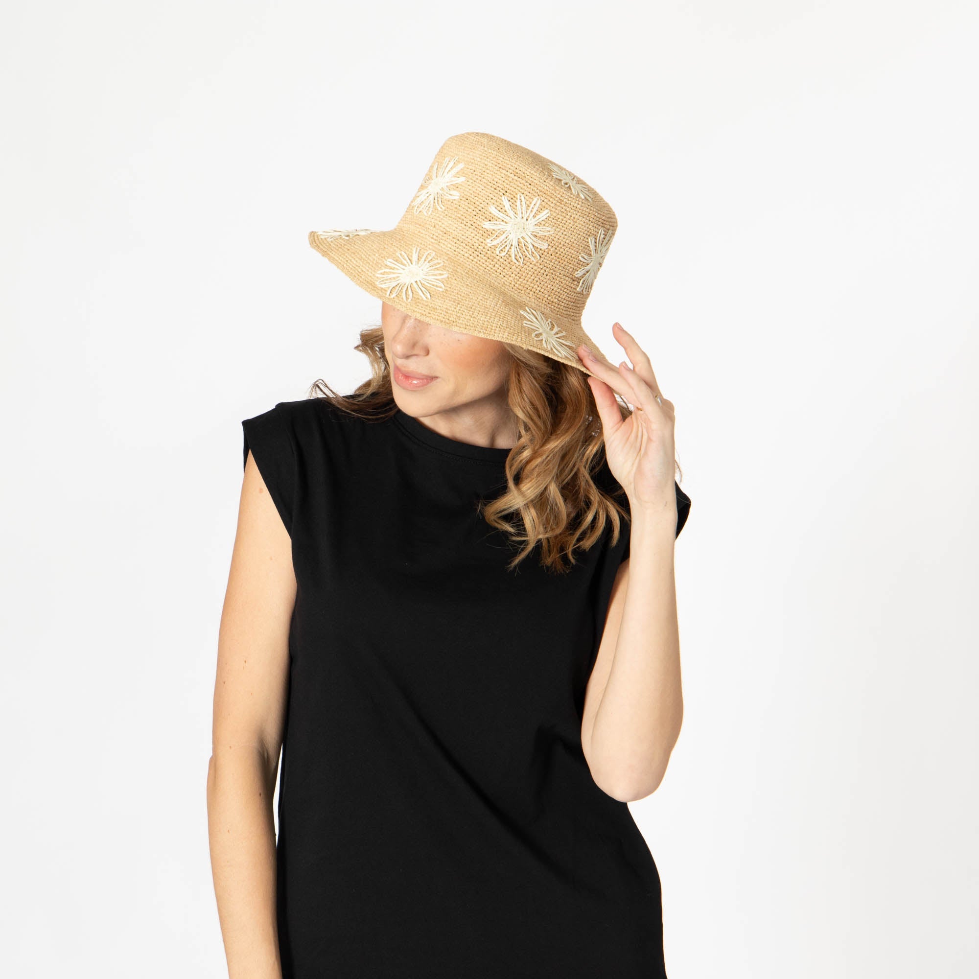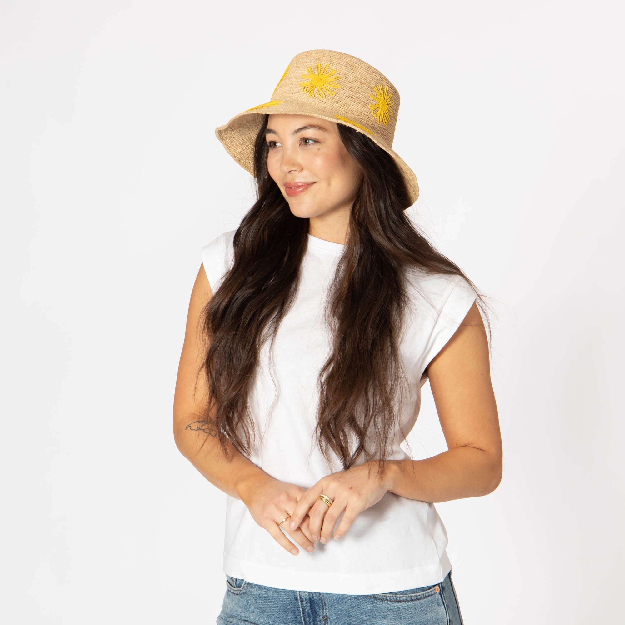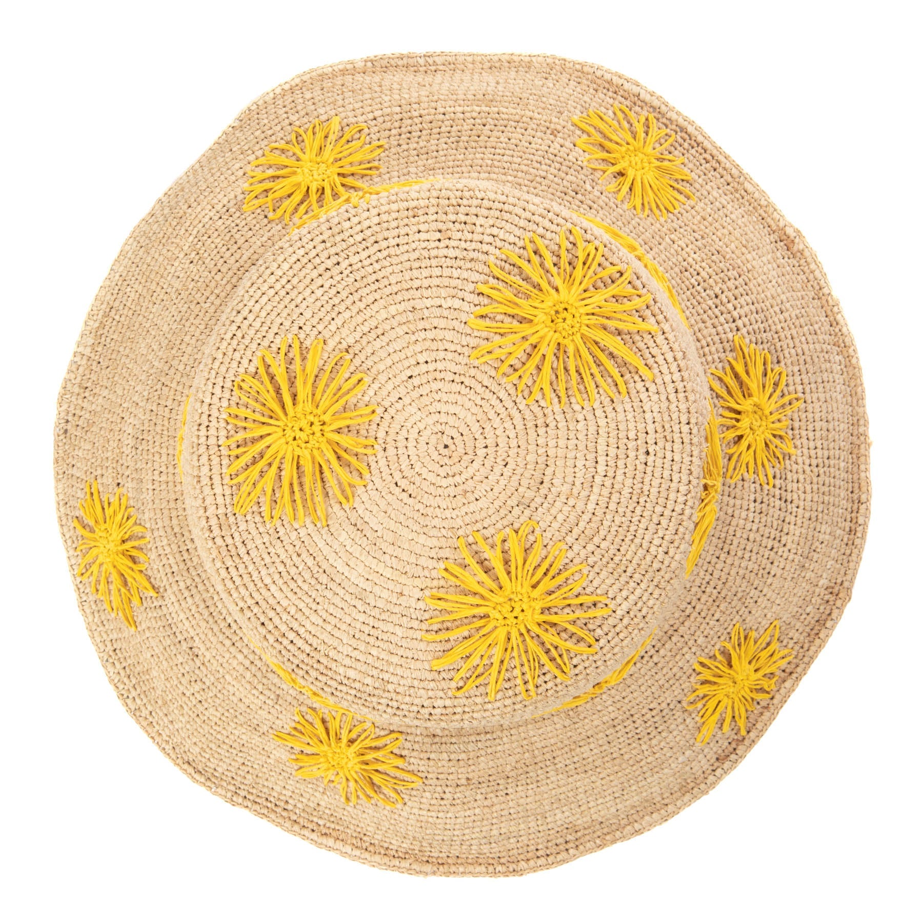 Stay stylish and protected with our Sol - Crochet Raffia Bucket hat! Made from 100% raffia, it features a 3.5' brim and UPF 50+ sun protection. The colorful embroidered flowers add a playful touch, and with adjustable sizing, you'll have the perfect fit. Available in tan, white, or yellow.