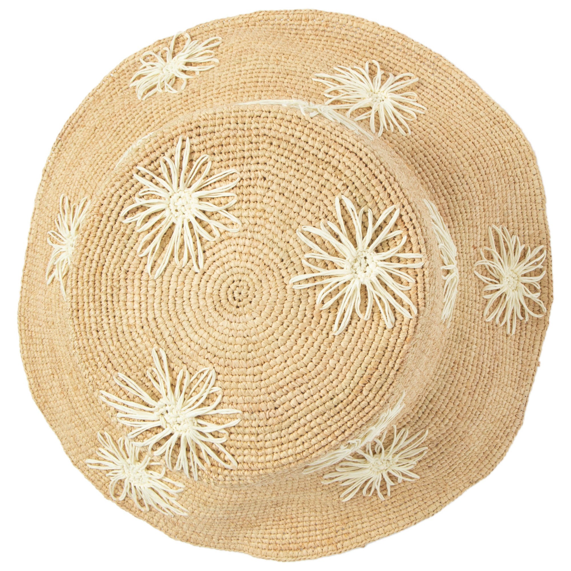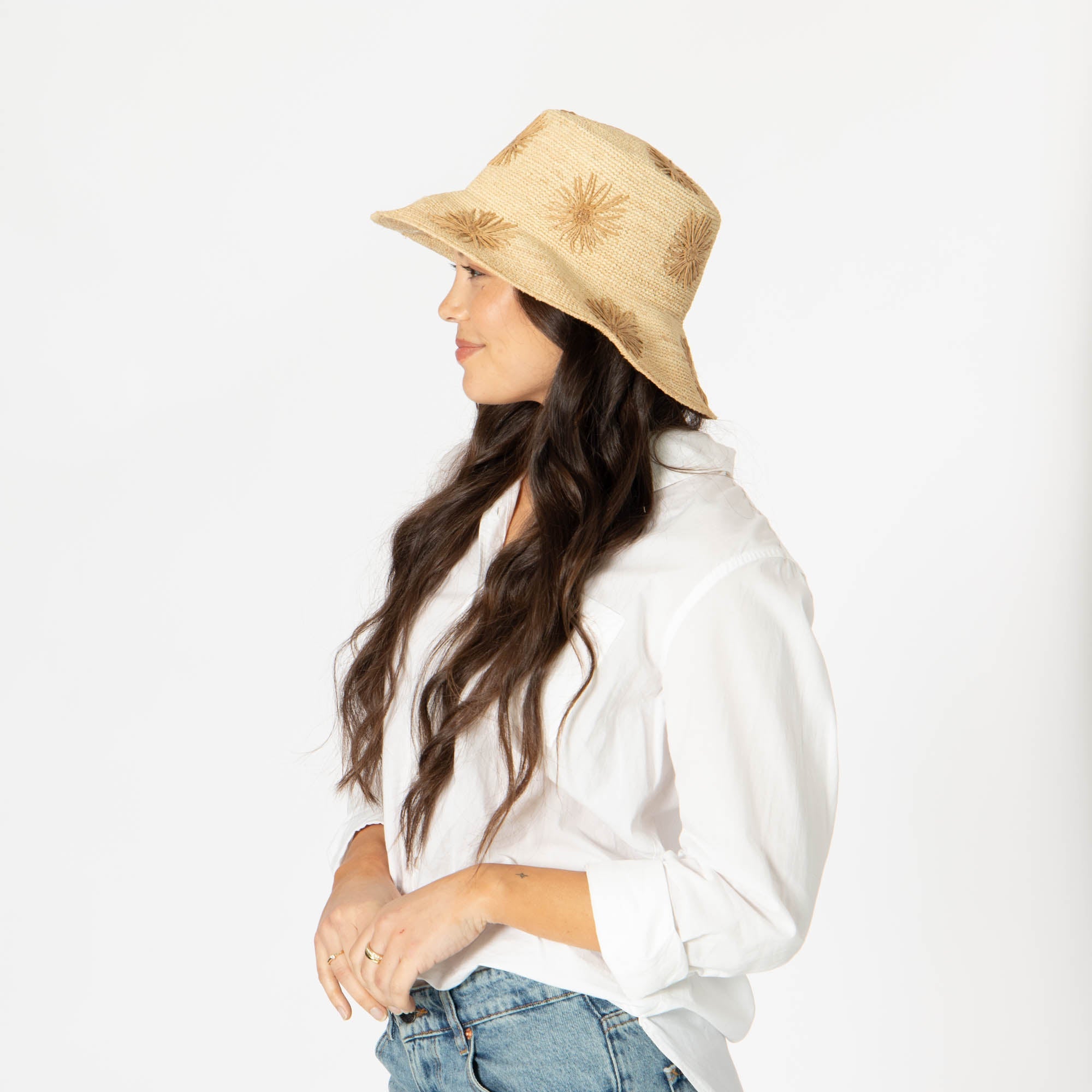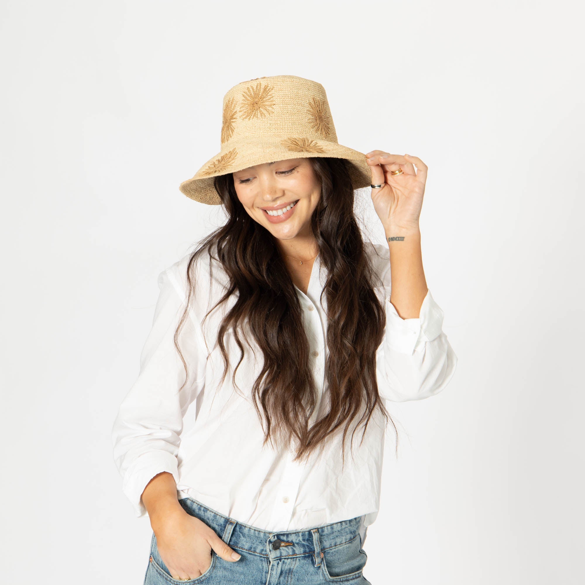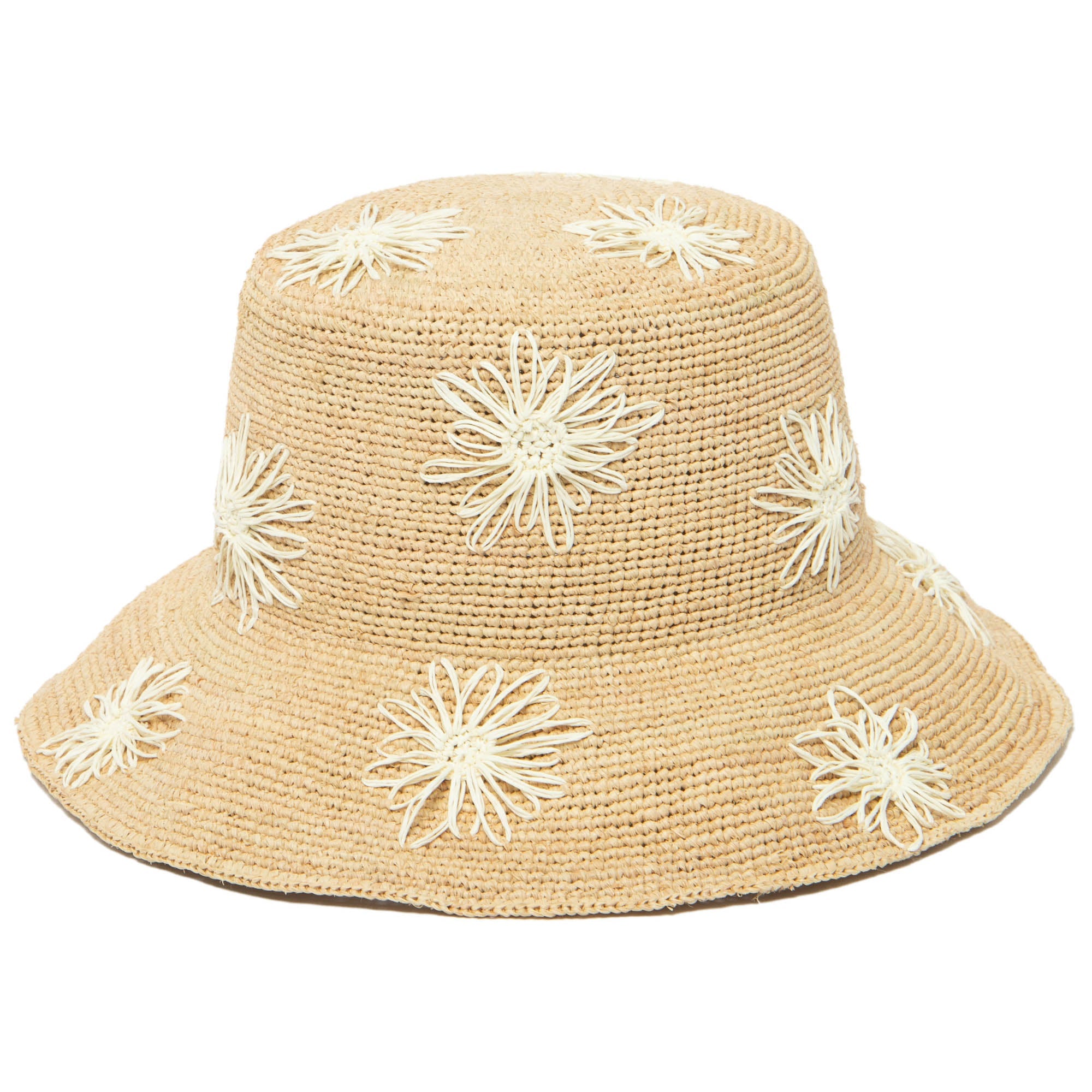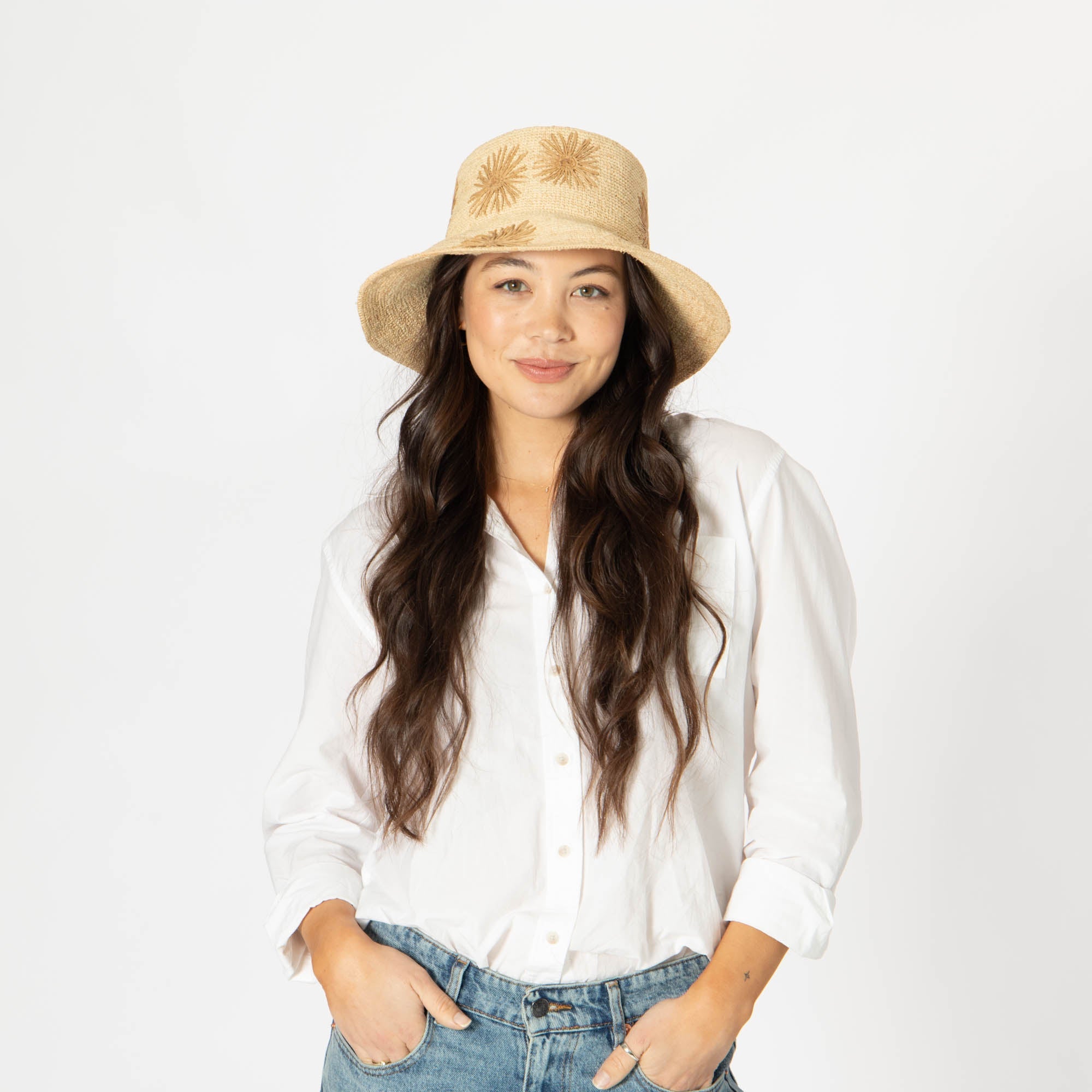 Stay stylish and protected with our Sol - Crochet Raffia Bucket hat! Made from 100% raffia, it features a 3.5' brim and UPF 50+ sun protection. The colorful embroidered flowers add a playful touch, and with adjustable sizing, you'll have the perfect fit. Available in tan, white, or yellow.